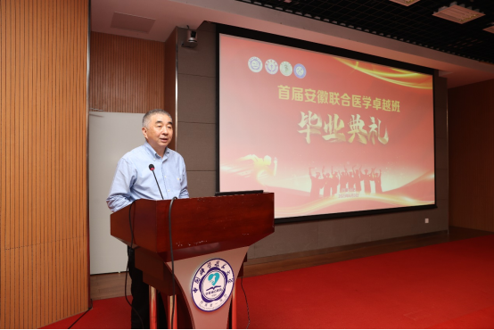 卞修武院士提到,两年前在中国科大附属第一医院见证了首届安徽联合医学卓越班学子的开班。两年时间同学们以优异的成绩完成了学业,展现了同学们敢于超越、奋勇争先的风采和精神面貌。并指出,中国科大自2017年建设新医学以来,一直以培养医生科学家为目标,安徽联合医学卓越班就是医学教育创新发展的新样板之一,与兄弟医学院校一起统筹规划,做好培养方案、课程体系建设和师资队伍保障等各项工作。希望未来能够有更多优秀人才加入到安徽联合医学卓越班中来。