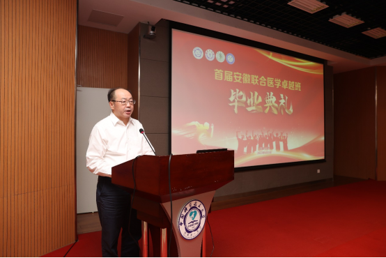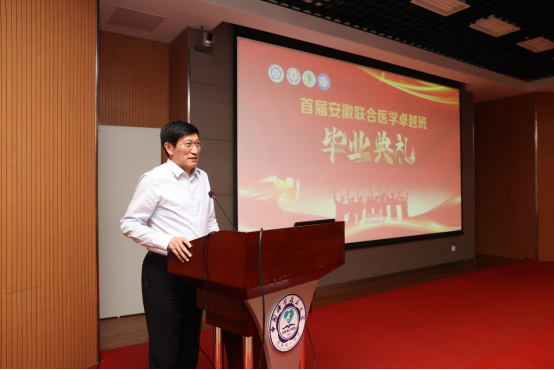 钱桂仑书记首先代表省教育工委、省教育厅祝贺同学们圆满完成学业,开启人生新篇章。他表示医疗卫生事业事关人民健康,事关社会稳定,事关国家安全。举办安徽联合医学卓越班是落实党中央、国务院决策部署的重要举措,也是落实立德树人根本任务的重要载体,更是落实加快医学教育创新发展实施方案的具体行动。希望同学们脚踏实地,立足祖国大地,在实干苦干中履践致远。省委教育工委、省教育厅将继续高度关注、大力支持安徽联合医学卓越班的举办。