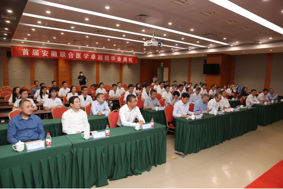 6月3日下午,首届安徽联合医学卓越班毕业典礼在中国科大附属第一医院南区会议中心举行。安徽省委教育工委书记、省教育厅厅长钱桂仑,安徽省卫生健康委员会党组书记、主任刘同柱,中国科学院院士、中国科大生医部临床医学院院长卞修武,中国工程院院士、安徽理工大学校长袁亮,皖南医学院院长姚应水,蚌埠医学院党委副书记姚文兵,安徽理工大学副校长鲁超,中国科大附属第一医院执行院长严光等领导以及首届安徽联合医学卓越班全体学生出席典礼。毕业典礼由中国科大生医部临床医学院执行院长、附属第一医院副院长翁建平主持。