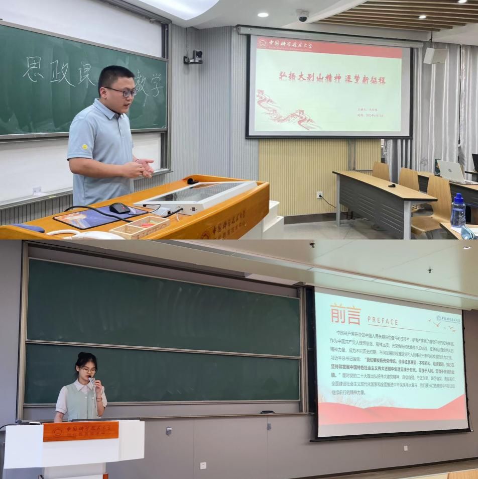 大学课堂上,“大学生讲思政课”正如火如荼地进行着,马克思主义学院研究生郑静雯、马红伟分别进行了讲述。他们对大别山精神进行了梳理,指出这是在党的领导下,以金寨为代表的大别山人民在血与火的斗争中展现出的精神特质。这是弘扬伟大建党精神,在区域革命实践中的伟大创举,它造就了大别山区“21年革命武装斗争持续不断、30年革命红旗始终高高飘扬”的伟大奇迹。他们鼓励同学们要充分发挥精神的力量,传承和发扬大别山精神,树立报国之志,勇攀科技高峰。来自马克思主义学院的查至行同学说:云上参观、网络教学,再加上“小老师”讲课,让我对大别山精神有了比较全面、深入的了解,也让我这个安徽人倍感自豪和骄傲。一代一代共产党人不忘初心牢记使命,塑造的伟大精神谱系内涵丰富,是新时代长征路上的精神宝库和动力源泉,我们要不断继承和发扬。