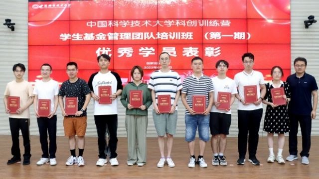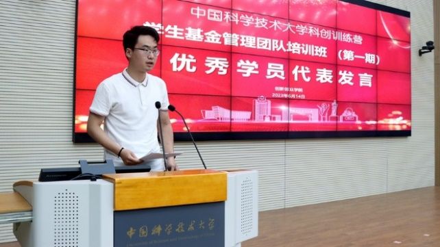 仪式上,还举办了科创训练营首期学生基金管理团队培训班结业仪式。创新创业学院副院长、校团委副书记刘淇老师为学生基金管理团队优秀学员们颁发荣誉证书。合肥微尺度物质科学国家研究中心2022级硕士研究生葛子健同学作为优秀学员代表发言,他从自身体会出发,围绕加入学生基金管理团队的初衷、经验收获及未来展望三个方面分享了学习感悟。