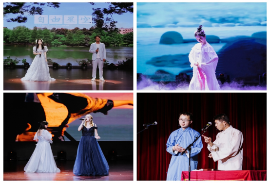 陈永焱和严笑寒深情对唱一首《自由星空》,今年也是这首歌正式发布的第十年,勾起了大家在科大点点滴滴的回忆;翩若惊鸿,婉若游龙,舞蹈串烧《瑶镜洛神&一片绿叶》展现出古典舞的优雅与科大学子青春活力;接下来由Dary莉雅、张小笛带来歌曲《My Heart Will Go On》,歌声嘹亮,悦耳动听;方玉航、宋楚喻带来精彩的相声《永远科大人》,让大家重温科大生活,享受快乐。