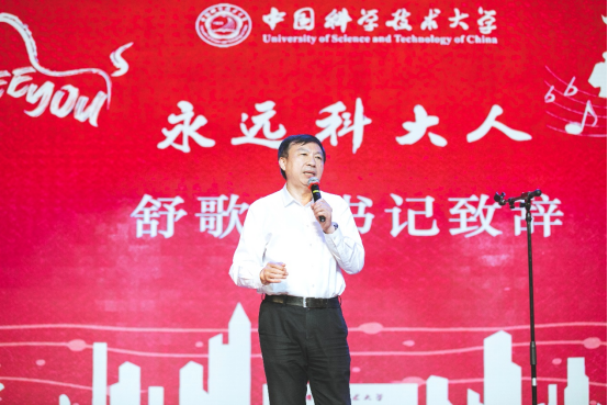 晚会上,舒歌群代表学校向全体毕业生送上祝福,并向辛勤培育同学们的老师和全心全意支持同学们的家长表示衷心的感谢。他指出,2023届毕业生在校学习和生活的时间正处于中华民族伟大复兴战略全局和百年未有之大变局的交汇期,希望大家能够牢记习近平总书记的嘱托,坚定不移听党话、跟党走,怀抱梦想又脚踏实地,敢想敢为又善作善成,在未来的工作生活中传承弘扬中国科大“红专并进,理实交融”的校训精神,不忘“科教报国,追求卓越”的初心使命,把科大的精神气质内化于心、外化于行,在各自的岗位上为中华民族伟大复兴贡献自己的力量。