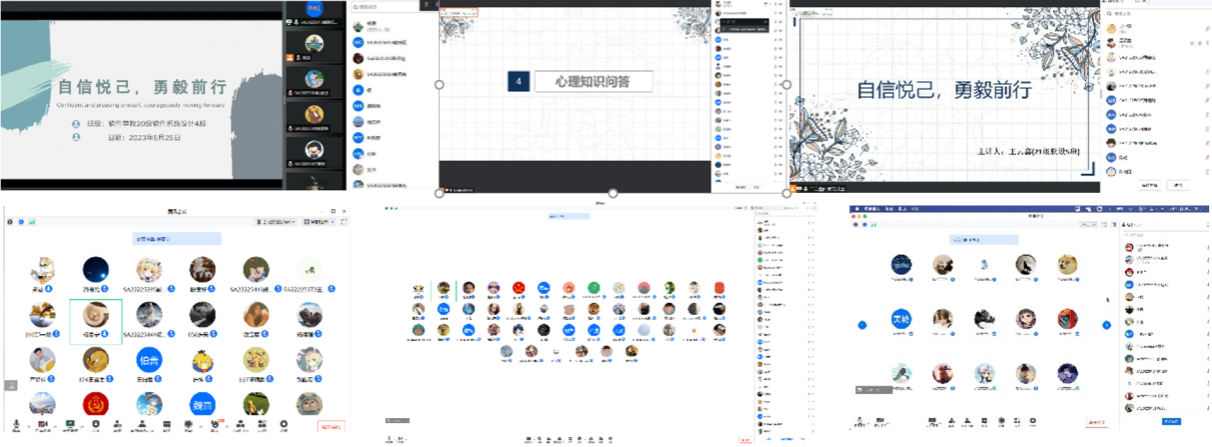 软件学院学生培养模式的特殊性,研一学生在合肥、苏州两地学习,二年级起分散在全国各地实习,“5·25”心理健康主题月各活动多采取线上、线下同时开展方式。围绕“自信悦己,勇毅前行”这一主题,学院各班级认真组织召开主题班会,同学们积极参与,交流分享彼此的经验和感受。良好宽松的氛围,缓解了同学们关于学业、实习、就业和生活等方面压力,既促进同学们心理健康,又增进同学间的交流、相互理解和包容。