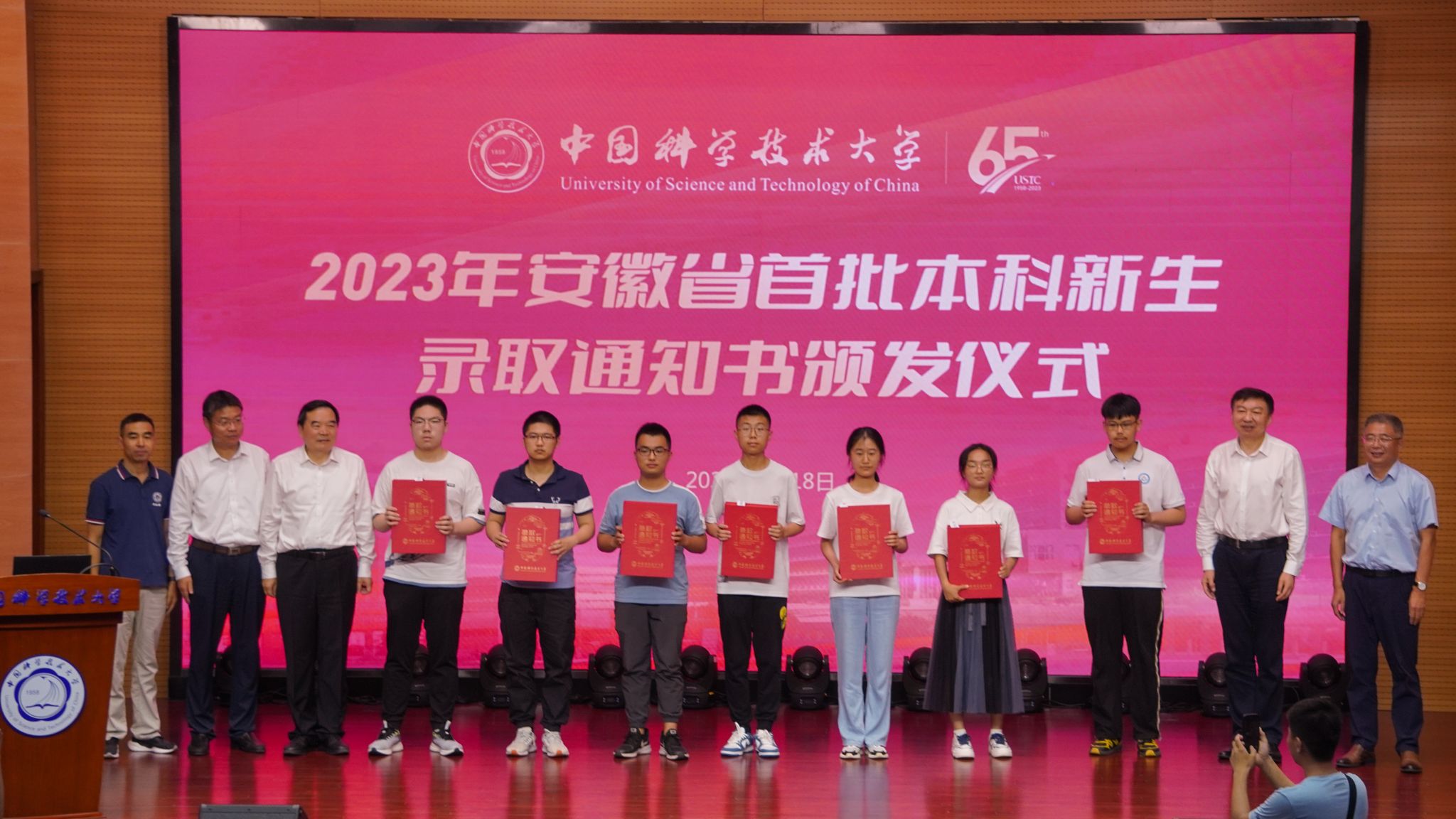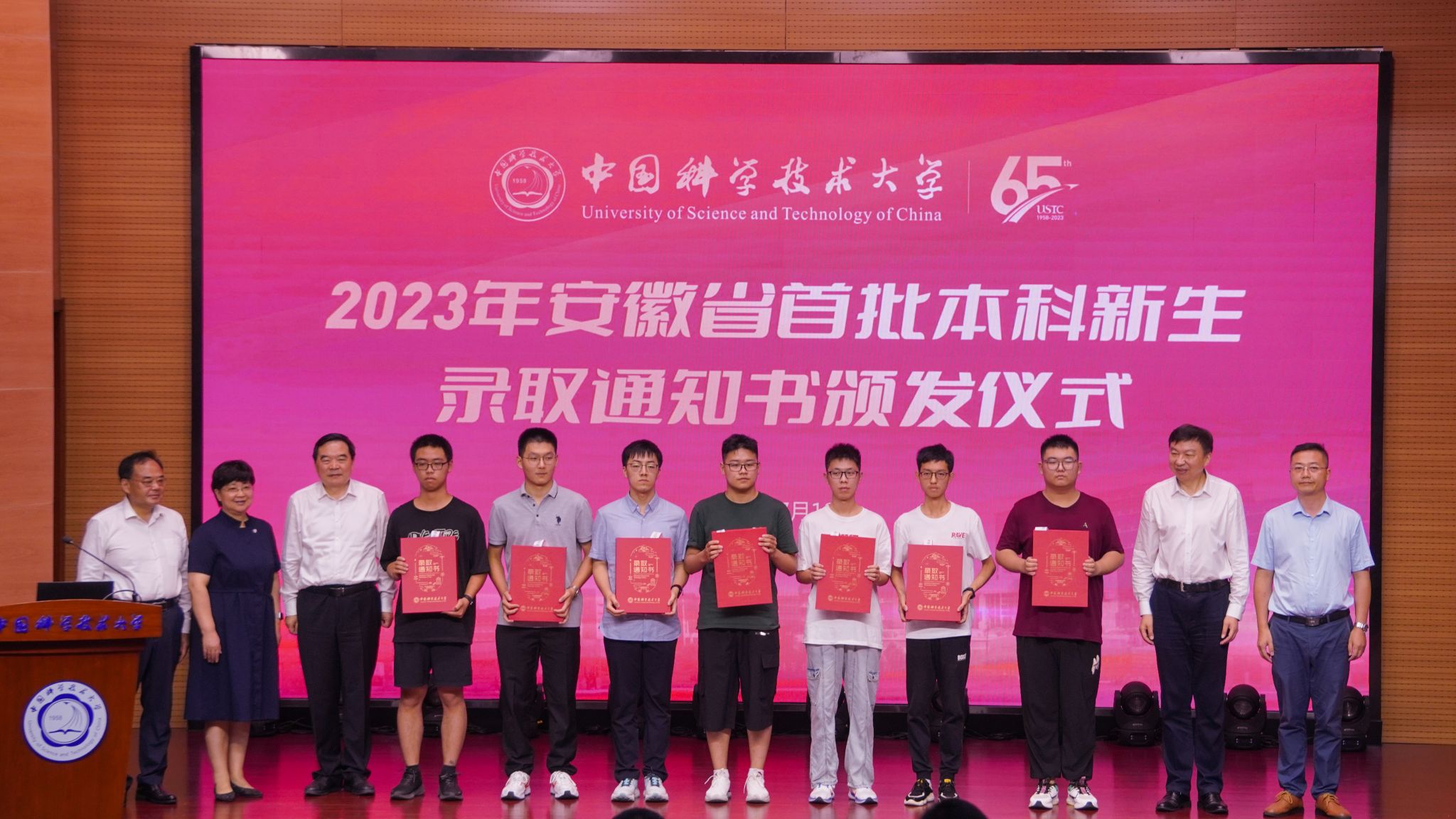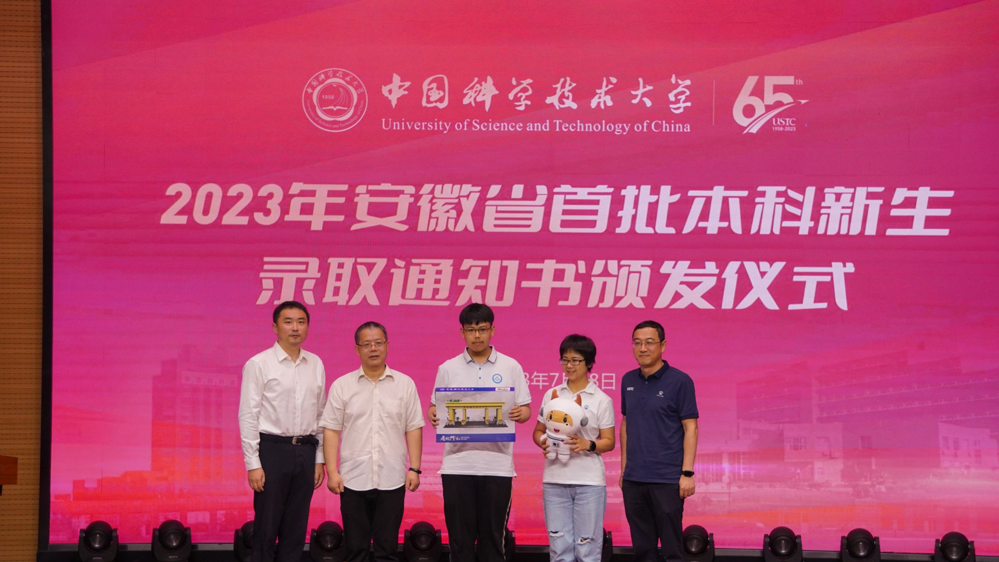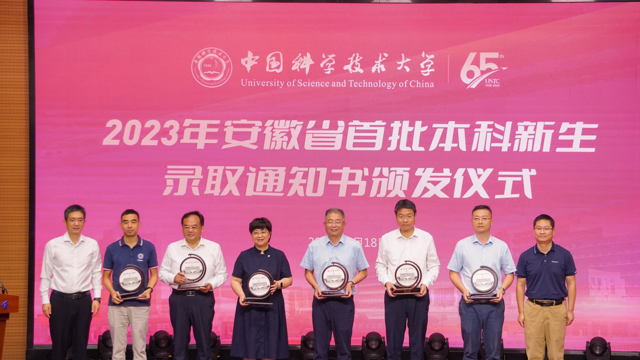 7月18日上午,中国科学技术大学2023年本科新生录取通知书颁发仪式在东校区水上报告厅举行。校党委书记舒歌群,校长包信和为录取的37位来自安徽省的部分本科新生现场颁发了录取通知书。合肥一中党委书记、校长封安保 ,安庆一中党委书记、校长陈文贞,霍邱一中党委书记、校长杨明生,寿县一中党委书记、校长王文永,岳西中学党总支委员、副校长金锋,中国科大附属中学党总支书记、校长汤胜受邀参加。基础教育集团、对外联络与基金事务处、招生就业处、定点帮扶工作领导小组等相关负责人,部分安徽招生组老师出席仪式。仪式由党委常委、副校长周丛照主持。
