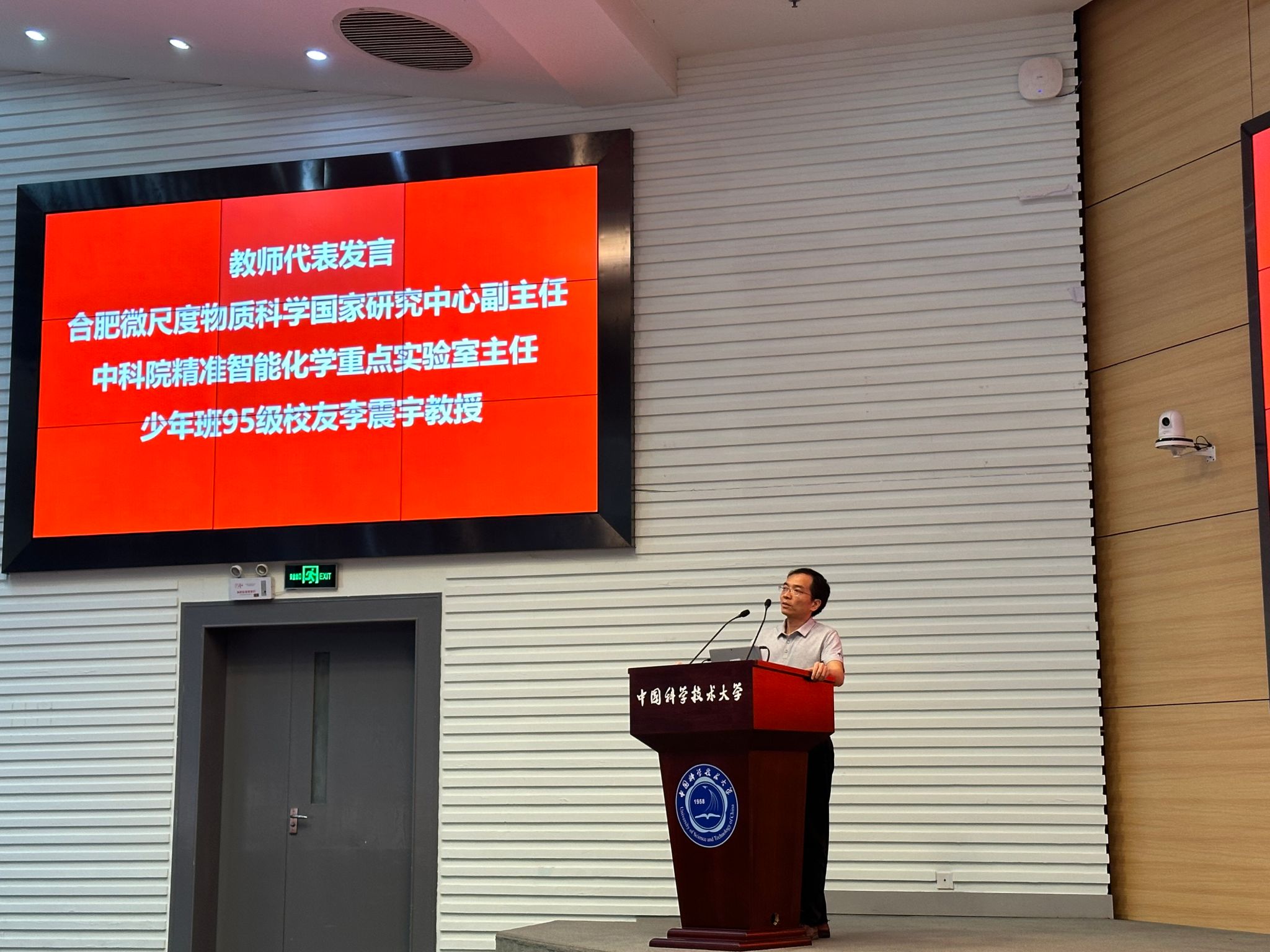 合肥微尺度物质科学国家研究中心副主任、中国科学院精准智能化学重点实验室主任、少年班95级校友李震宇教授作为教师代表发言。他结合个人学习经历,勉励同学们要志存高远,明确好自身的目标;要有开放的心态,勇于尝试,追求自己的兴趣;要做到自律,通过自律帮助自己达成目标。
