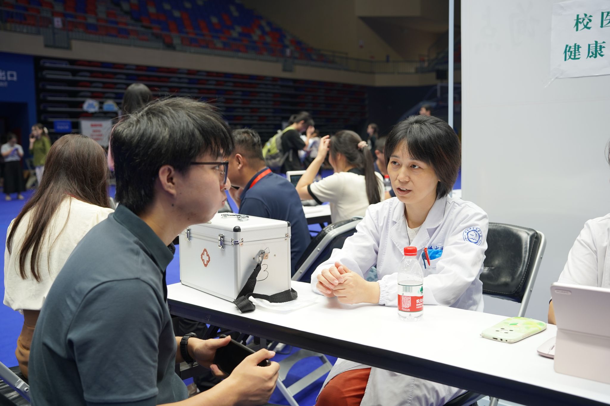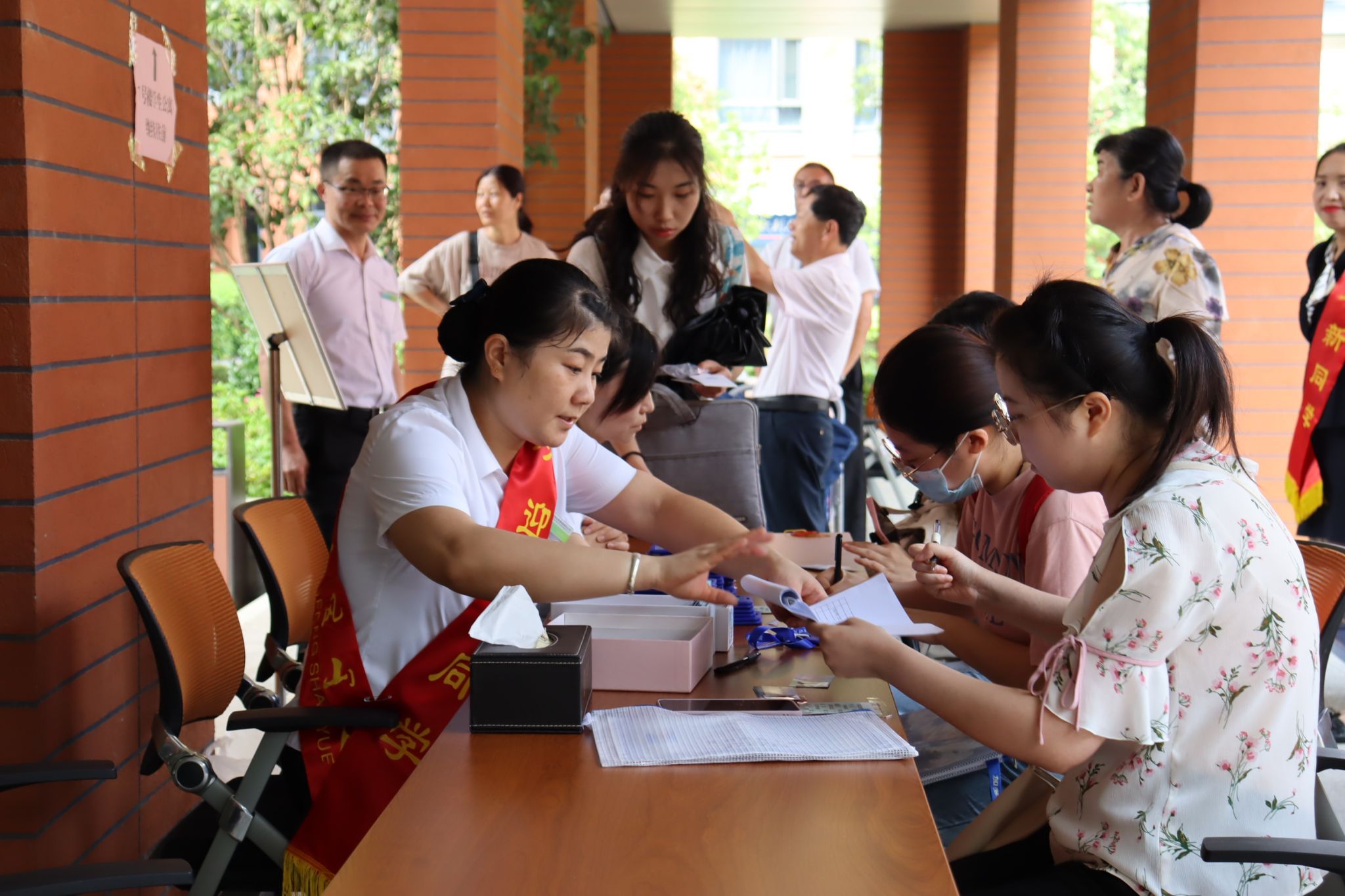 校团委、校芳草社等在各报到点设立多个志愿者接送点为新生提供咨询引导、行李看管等服务,研究生迎新志愿者共招募120人,东区4个点位28人、西区4个点位28人、中区3个点位18人、南区2个点位12人、高新区4个点位34人,所有同学按照上下午半天轮班。保卫处安排搬运车免费为新生搬运行李,校医院派驻人员提供应急医疗服务,饮食服务集团免费提供绿豆汤、菊花茶等消暑饮品。