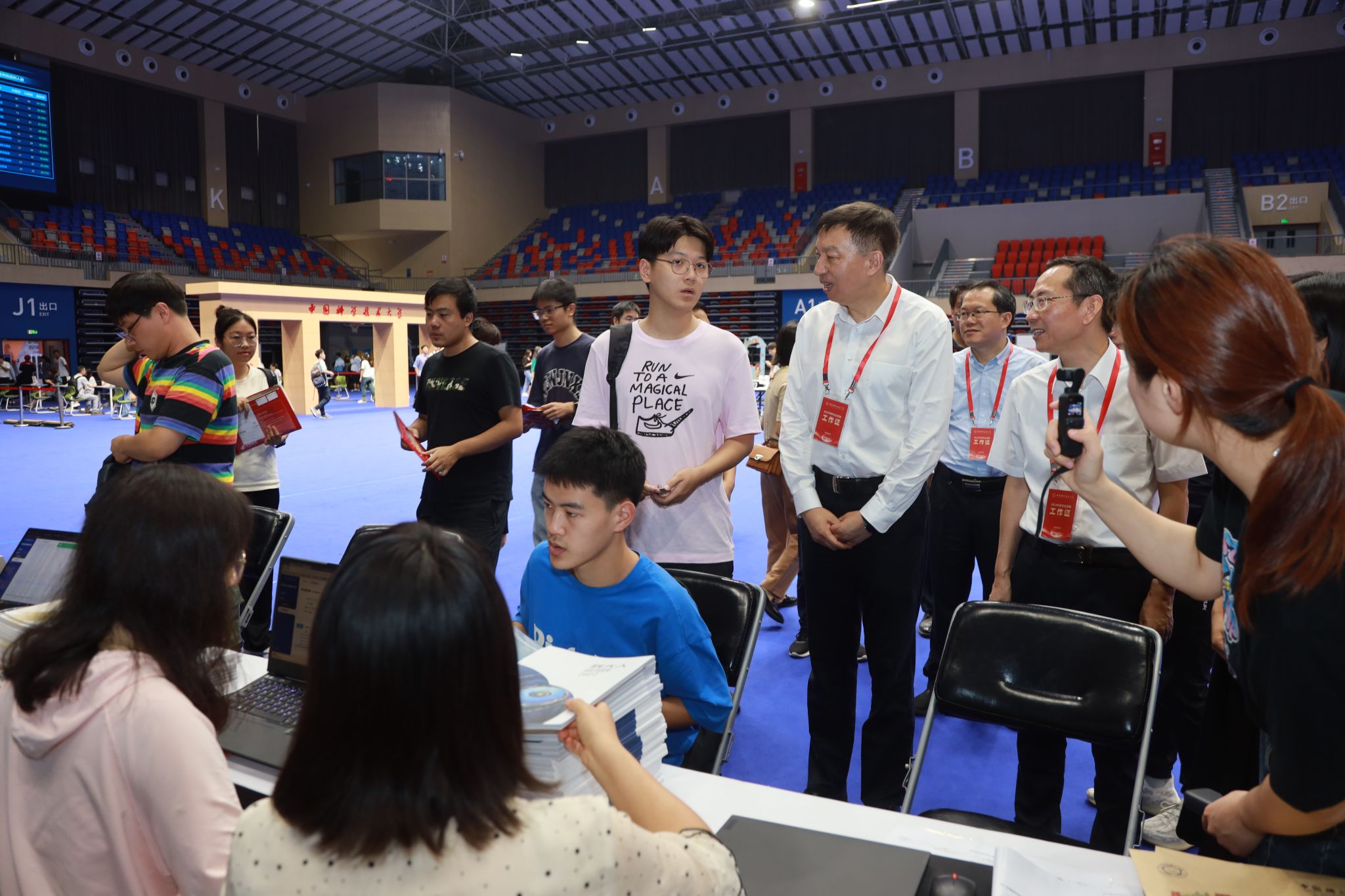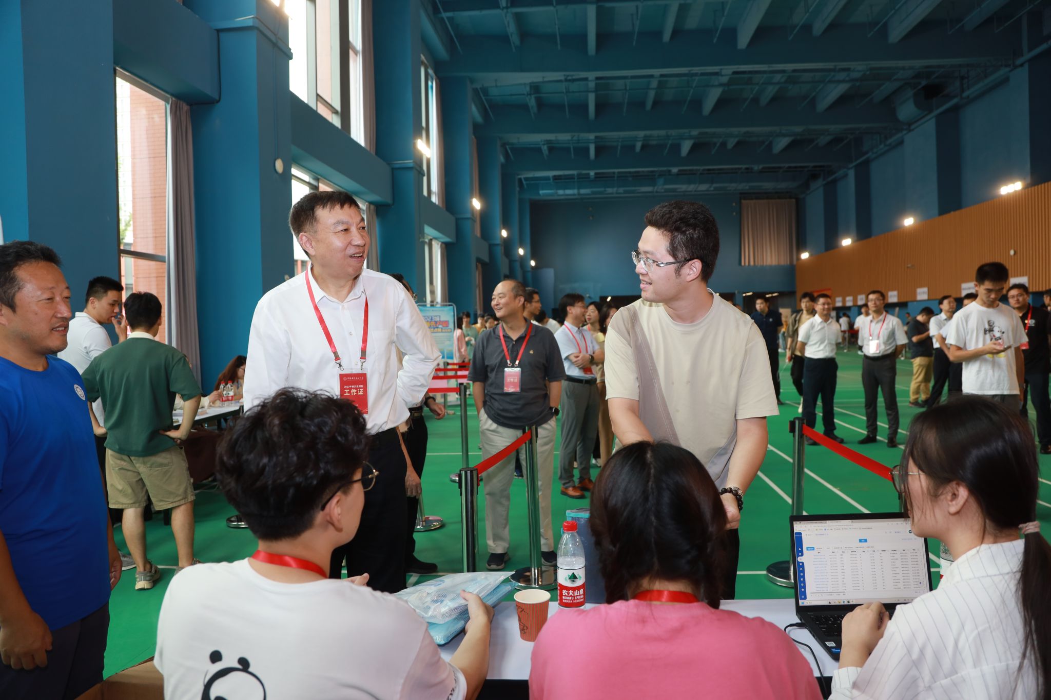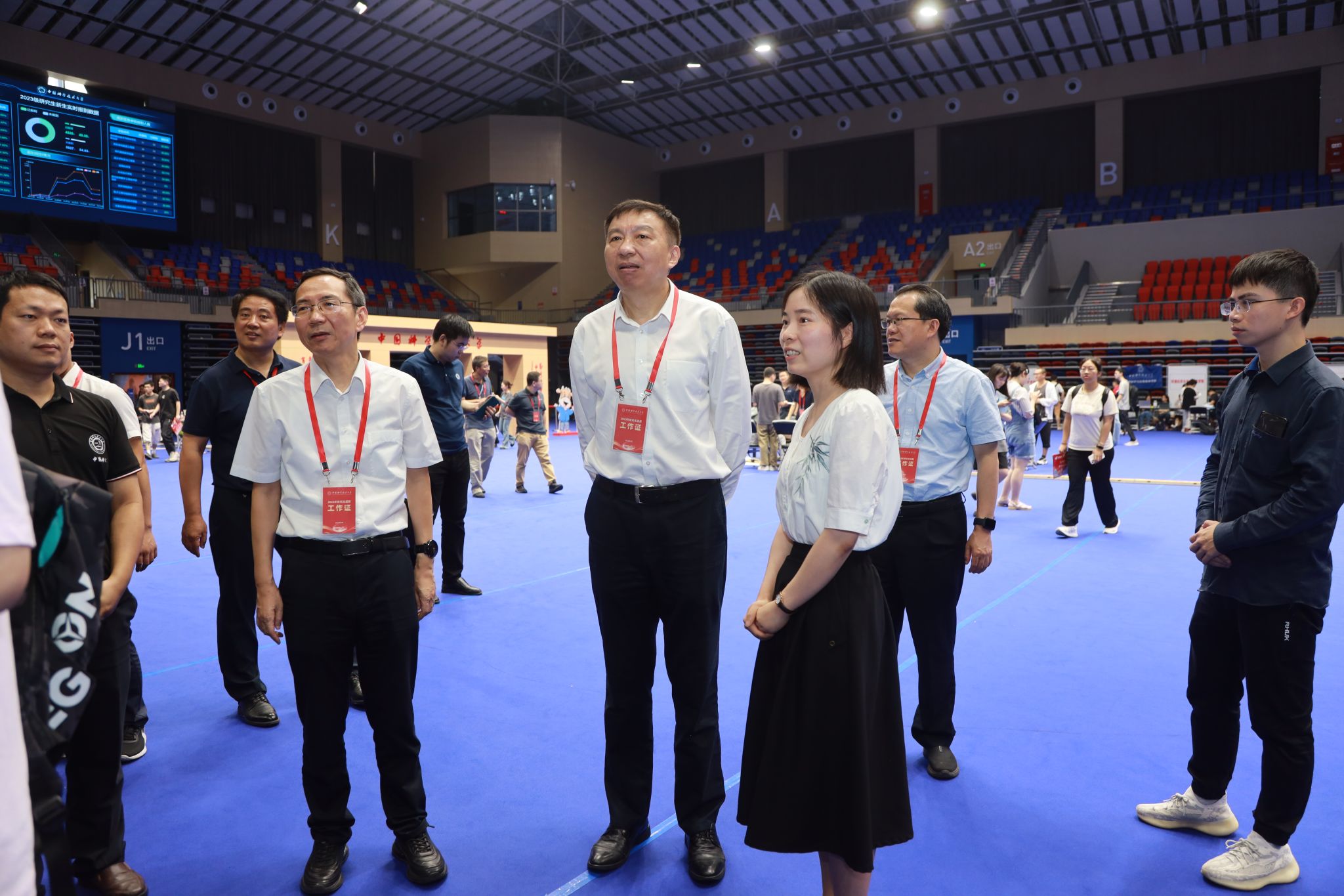 随后,舒歌群一行来到中校区体育馆调研学生报到迎新情况。体育馆两边的大屏幕上,实时播放着现场报到数据。舒歌群详细询问各学院招录计划、已报到人数与比例、生源地、学籍管理、迎新特色活动等情况,并对迎新志愿者们的辛勤付出表示感谢,对学校相关单位和部门间的通力合作和细致服务表示肯定。
