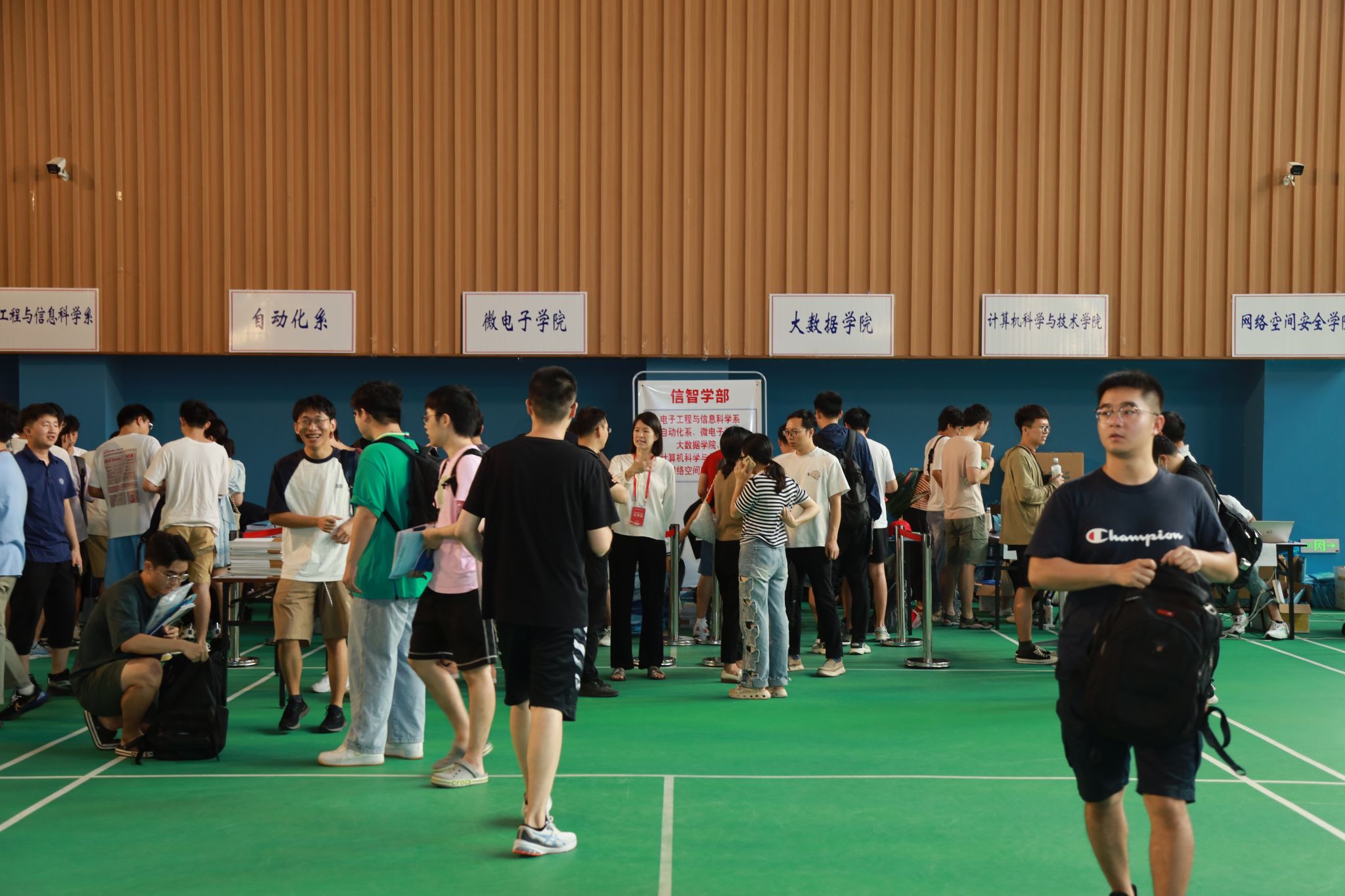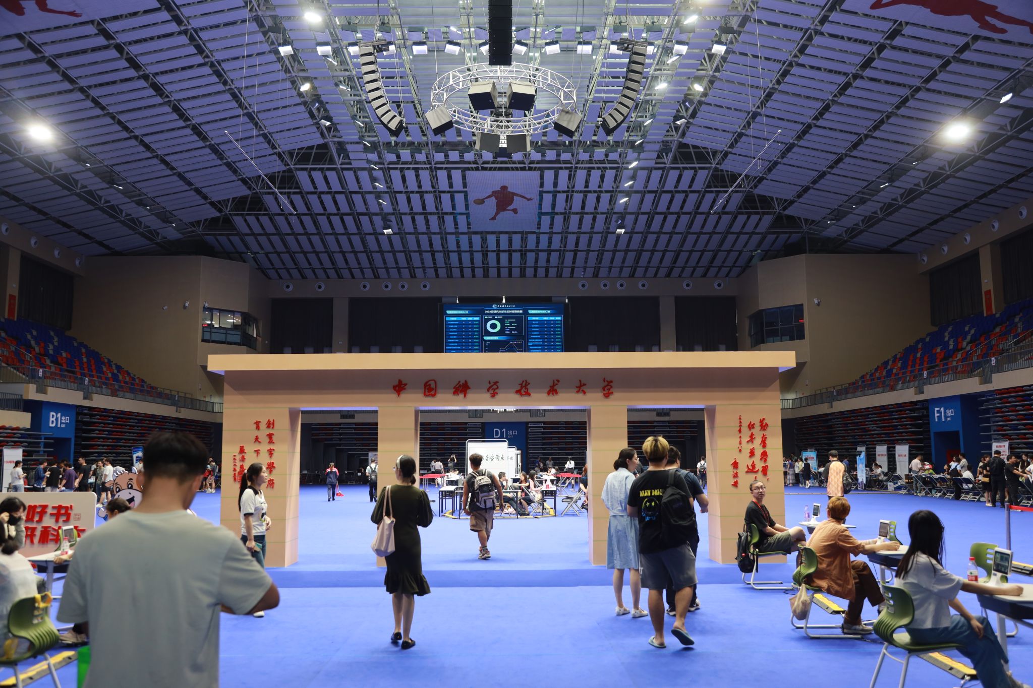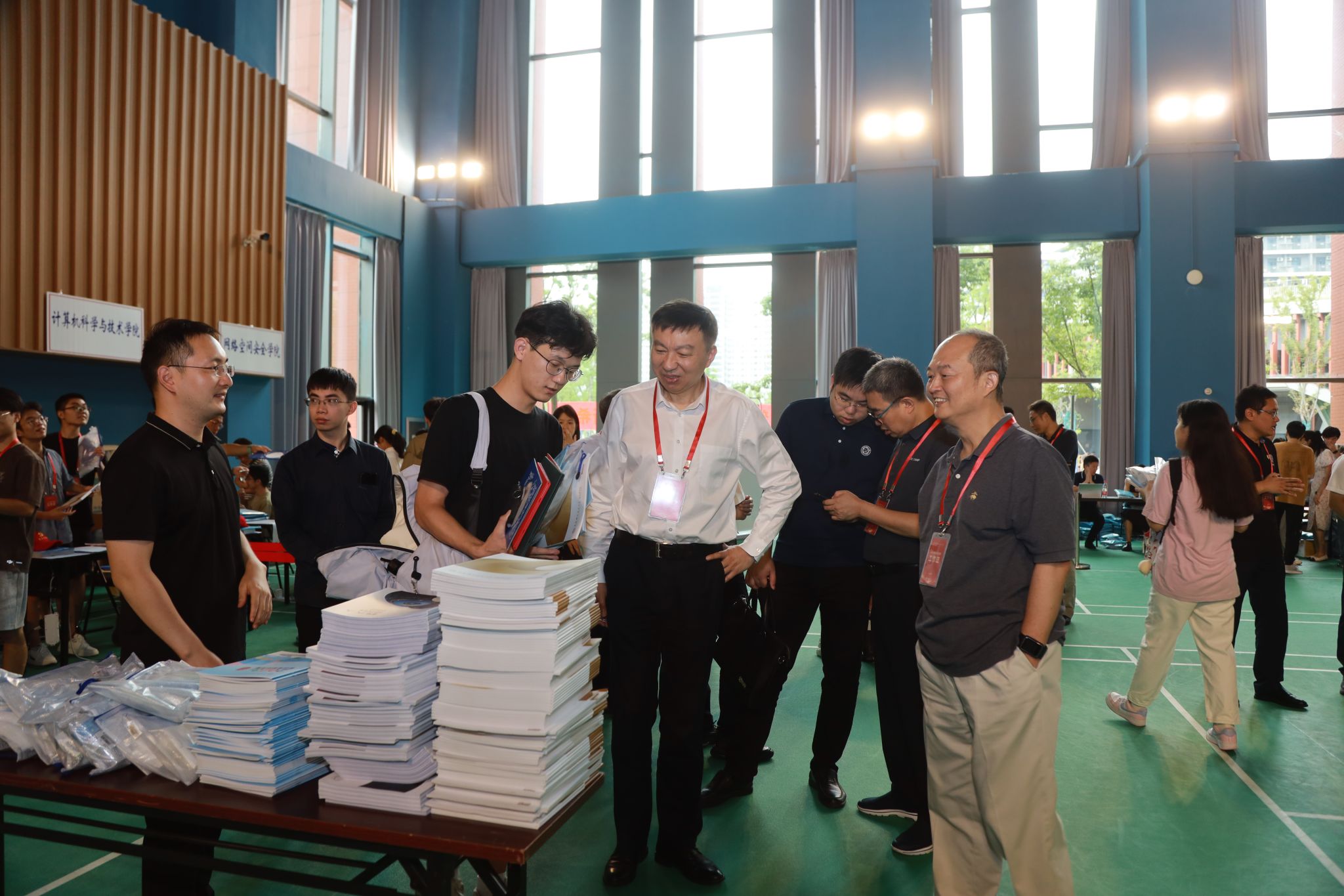 随后,舒歌群一行来到中校区体育馆调研学生报到迎新情况。体育馆两边的大屏幕上,实时播放着现场报到数据。舒歌群详细询问各学院招录计划、已报到人数与比例、生源地、学籍管理、迎新特色活动等情况,并对迎新志愿者们的辛勤付出表示感谢,对学校相关单位和部门间的通力合作和细致服务表示肯定。