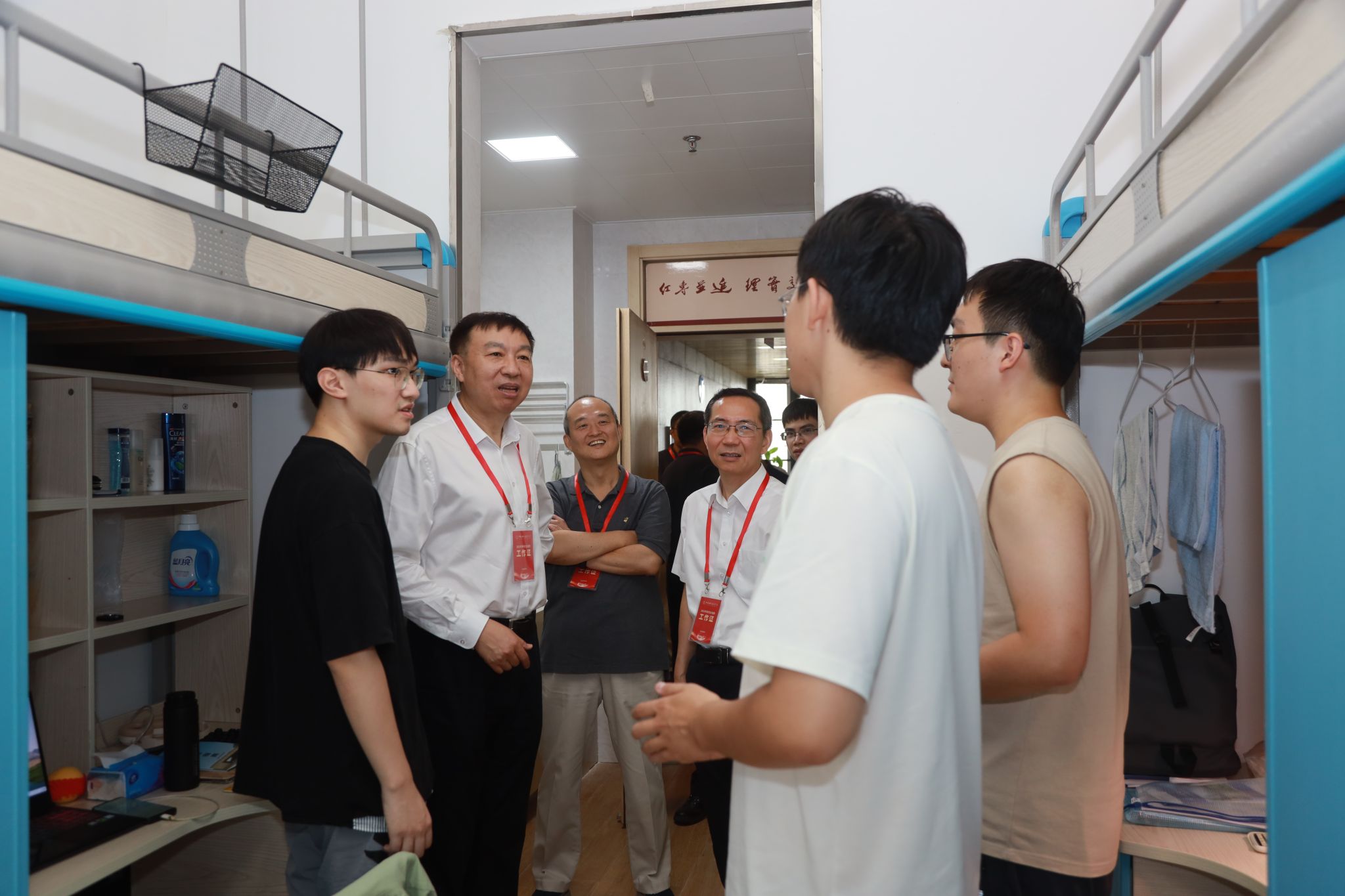 在高新园区,舒歌群一行分别前往羽毛球馆集中报到点、学生公寓、3号学科楼,实地考察新生报到和开学安排、宿舍居住环境以及教室升级改造等情况。在集中报到点,舒歌群仔细询问新生籍贯、本科毕业院校、目前学习专业等,勉励同学们尽快适应新环境,早日进入学习和科研状态。在学生宿舍,舒歌群考察了宿舍配套设施建设和运行现状,与入住研究生亲切交流,详细询问在校生活的满意度和舒适度,并祝福同学们学习进步、生活工作愉快。在3号学科楼,舒歌群考察了教室设备和多媒体功能厅升级改造进展,并询问教育教学活动开展情况。