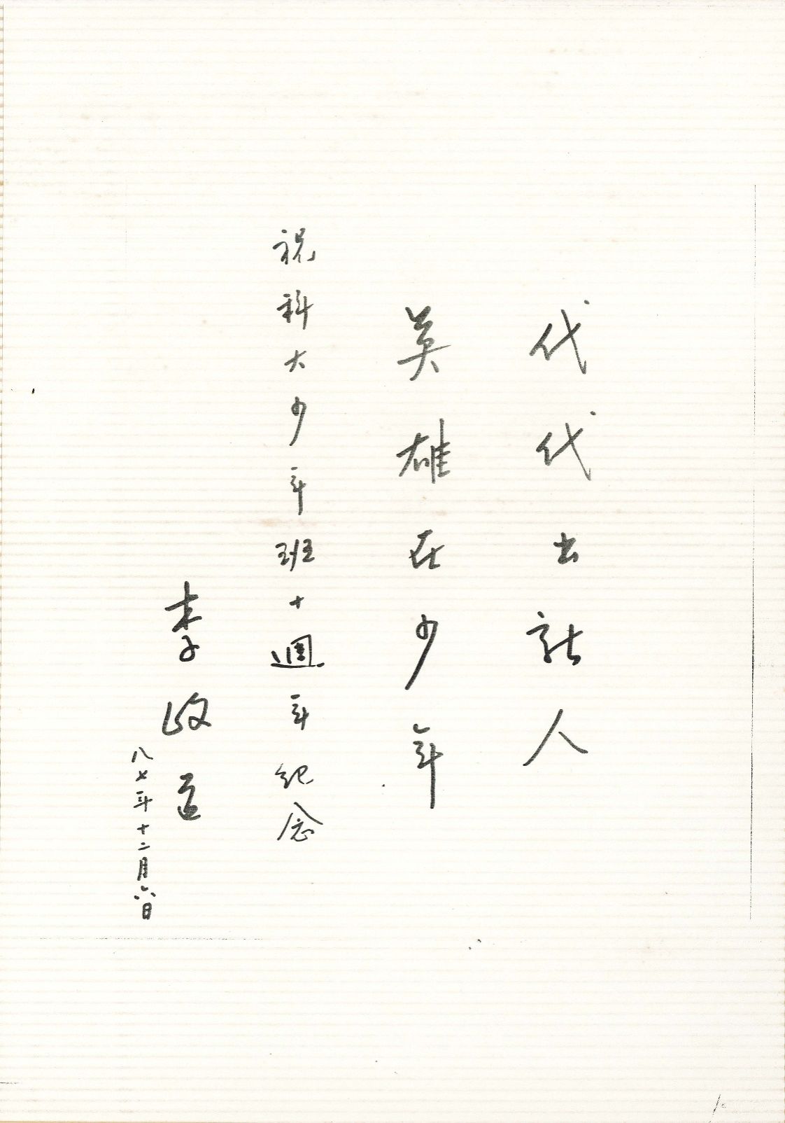 1978年,少年班成立后,李政道先生保持了一贯的关注和支持。他2次来校与少年大学生座谈,4次为少年班题词,蕴含了对祖国教育事业和青年一代的殷殷期盼。