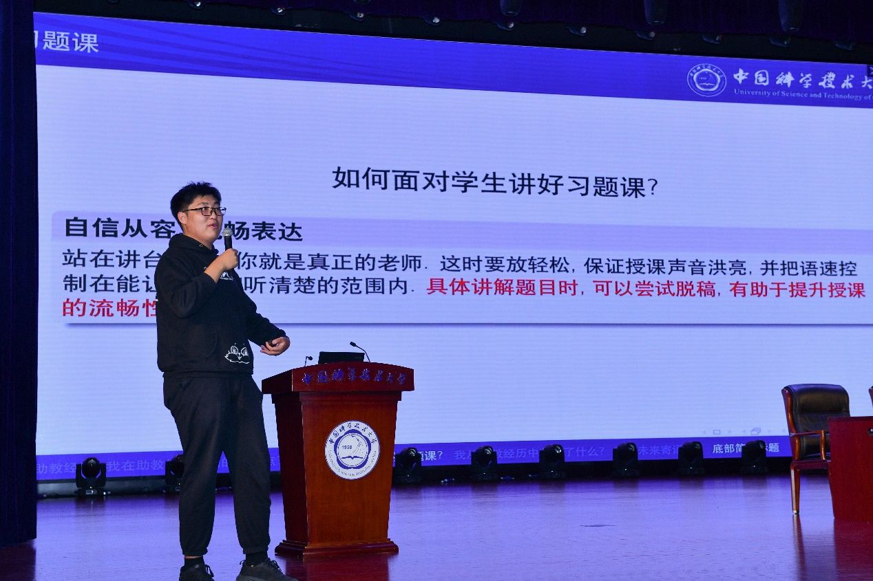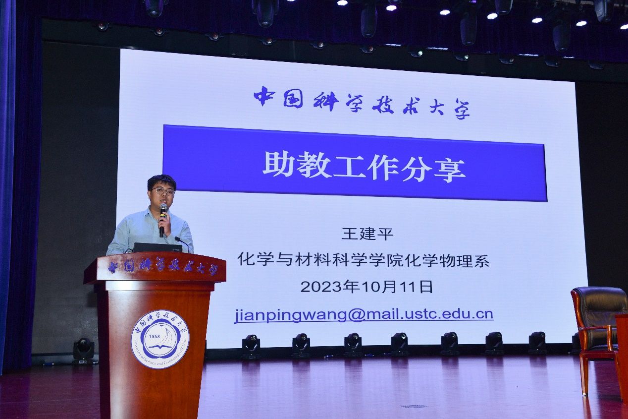 为发挥优秀助教的示范引领作用,本次会议邀请了两位优秀助教进行助教同辈分享。2020级少年班学院本科生黄天一同学曾担任《微分方程引论》和《复分析》两门课程的助教,他以“如何讲好属于你的习题课”为主题,从准备习题课的内容、课堂讲授方式,以及课后答疑与反思等方面分享了对助教工作的理解和感悟,并总结了这个过程中的成长与收获。2020级化学与材料科学学院本科生王建平同学曾担任《化学原理A》和《物理化学B》两门课程的助教,他坦言“在科大,很多知识和经验都是通过学长学姐们传递下来的,本科前两年的生活中曾得到很多优秀且热心的助教帮助,在我有能力的时候,我也希望能帮助到我的学弟学妹们,让他们少走弯路。”他从成为助教前、助教工作中、工作结束后三方面分享了自己的经验,同时强调了与主讲教师沟通的重要性。