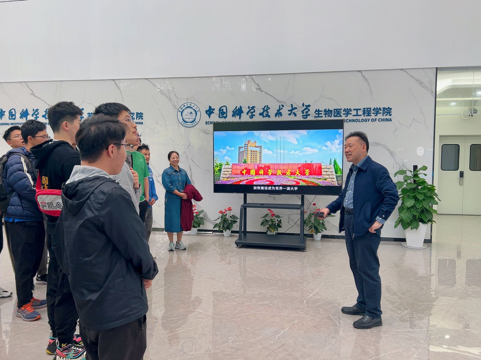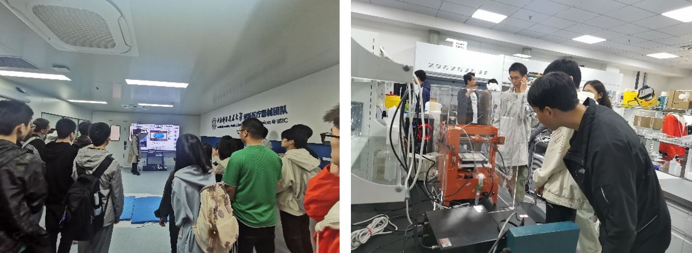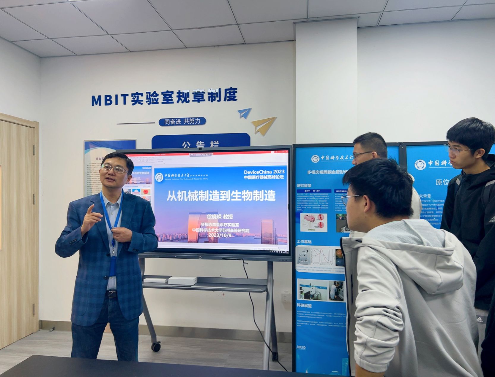 在生物医学工程学院多模态血管诊疗实验室,中国科大苏州高等研究院人力资源部部长徐晓嵘教授以《从机械制造到生物制造》为题,为同学们做了精彩的分享。他结合自己求学和工作经历,介绍了从最初的精密仪器专业到后来的生物医学工程领域,经历了跨学科的挑战与创新,为同学们讲解了目前从事的主要科学研究方向,并与大家进行了互动交流。