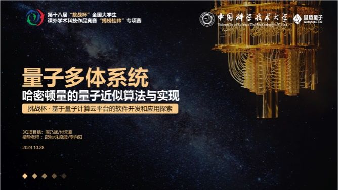 10月27日至31日,第十八届“挑战杯”全国大学生课外学术科技作品竞赛终审决赛在贵州大学举行。来自全国2000多所高校的250万多名学生参赛,经过校级初赛、省级复赛和全国决赛初评,主体赛和“揭榜挂帅”专项赛分别有700余件作品入围终审决赛。经过激烈角逐,我校化学与材料科学学院博士研究生葛丽爽同学负责的《满面红光全球领先的下一代近红外Pe(钙钛矿)LED缔造者》荣获主体赛特等奖,物理学院硕士研究生周乃斌同学负责的《量子多体系统哈密顿量的量子近似算法与实现》荣获“揭榜挂帅”专项赛特等奖,管理学院硕士研究生李东昆同学负责的《中科元创—下一代储能逆变器领航者》荣获主体赛一等奖,合肥微尺度物质科学国家研究中心硕士研究生赵先和同学负责的《大规模量子线路模拟包—TensorQ》荣获“揭榜挂帅”专项赛一等奖,少年班学院李迈同学负责的《Captamer—新型蛋白质定量检测系统》荣获主体赛二等奖,少年班学院刘雨辰同学负责的《“见微知著”—全球首台基于量子涨落的扫描探针显微镜》、纳米科学技术学院硕士研究生李钰同学负责的《高频高功率GaN电力电子器件》荣获主体赛三等奖。我校所获特等奖数、一等奖数及奖牌总数重回历史巅峰!时隔12年,我校再次捧得优胜杯!我校创新创业学院、校团委、物理学院、化学与材料科学学院及工程科学学院等校内相关单位、院系负责老师全程带队参赛。