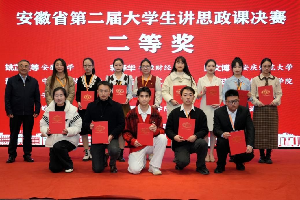 12月22日,由中共安徽省委教育工委主办、教育部高校思想政治工作队伍培训研修中心(安徽师范大学)承办的安徽省第二届大学生讲思政课决赛在安徽芜湖举办。经过激烈的现场角逐,我校马克思主义学院参赛团队创作的作品《点燃科技人才引擎,激活高质量发展新动能》荣获二等奖,指导教师孔亮、江可可获“优秀指导教师”荣誉称号。
