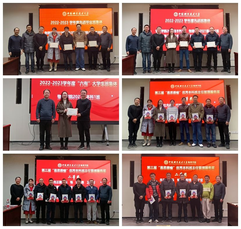 张永生宣读表彰文件,陈向军、陈宇翱为获得中国科学技术大学先进班集体、“六有”大学生班集体、先进毕业班集体、“易思善喻”优秀本科班主任管理服务奖的班级和个人颁发荣誉证书。