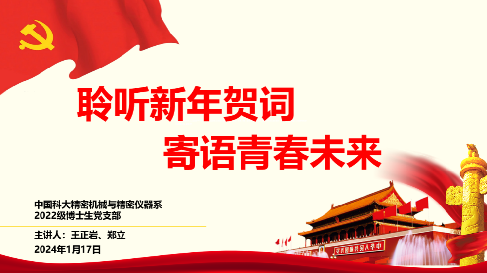 日月开新元,万象启新篇。1月17日下午,精密机械与精密仪器系2022级博士生党支部开展了“聆听新年贺词,寄语青春未来”主题党日活动。全体党员集中学习了习近平主席二〇二四年新年贺词,并围绕新年贺词重要内容分享感悟,书写寄语。活动由支部书记施瑞琪主持,王正岩、郑立主讲,全体支部党员参与。