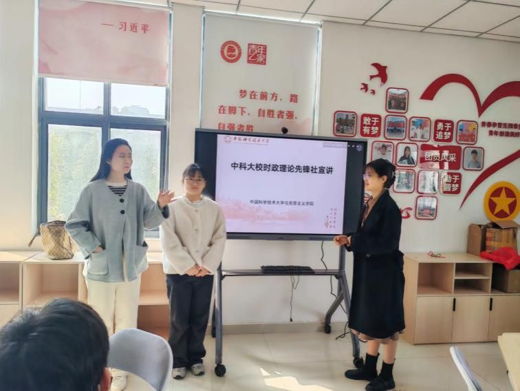 随后,宣讲团成员前往多媒体教室开展专题宣讲。宣讲员们首先简要介绍了中国科学技术大学、马克思主义学院、时政理论先锋社的基本情况,然后围绕“青年于历史长河中的重要性”“百年前的中国青年”“新时代的中国青年”“吾辈青年,热血依旧”等四个方面展开宣讲。