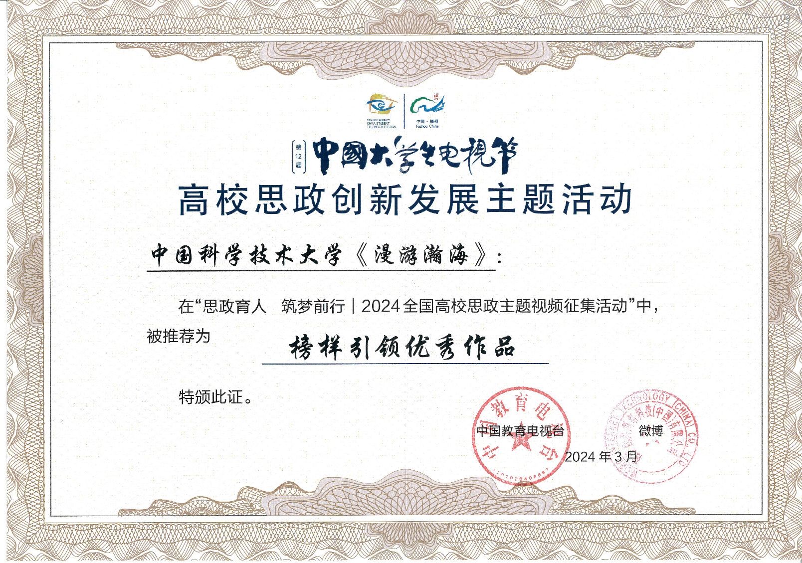 近日,第十二届中国大学生电视节“高校思政创新发展主题活动”在福州大学举行。在2024全国高校融媒体发展创研会上,公布了“思政育人 筑梦前行”2024全国高校思政主题视频征集活动奖项,由我校党委宣传部牵头组织创作的《漫游瀚海》MV被推荐为“榜样引领优秀作品”。