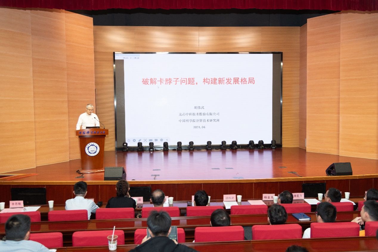 4月24日下午,中国科学技术大学“德创卓越大讲堂”首期活动在东区水上报告厅举行。龙芯中科技术股份有限公司董事长、中国科学院计算技术研究所研究员、我校1986级校友胡伟武应邀作主题报告。中国科大副校长杨金龙院士,研究生院副院长石龙,对外联络与基金事务处副处长赵林,计算机科学与技术学院党委书记徐宏力,信息科学技术学院副院长陈勋,网络空间安全学院副院长陈彦,研究生院培养办公室主任王莉,龙芯中科技术股份有限公司相关负责同志出席报告会。报告会由研究生院副院长李思敏主持。