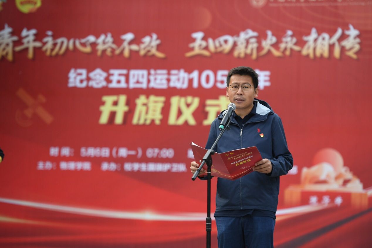 为进一步学习传承五四精神,弘扬“红专并进,理实交融”的校训精神,2024年5月6日清晨,物理学院在东区郭沫若广场举行“青年初心终不改,五四薪火永相传”暨纪念五四运动105周年升旗仪式。校团委副书记、物理学院青年教师代表李海欧,物理学院党委副书记凌锋,物理学院本科生物理学专业 和应用物理学专业两个党支部全体成员、发展对象、入党积极分子和自发前来观礼的广大师生校友参加仪式。仪式由物理学院物理学专业本科生党支部预备党员胡子谦主持。