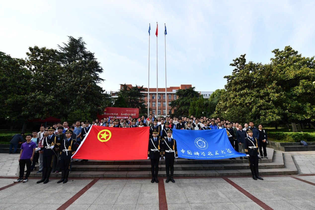 早上7点整,升旗仪式正式开始。随着主持人喊出“出旗”,物理学院本科生党支部成员组成的仪仗队迈着坚定有力的步伐,护卫着鲜红的国旗、蓝色的中国科学院院旗和中国科学技术大学校旗,一步一步向着升旗台迈进,气氛庄严肃穆。伴随着《义勇军进行曲》,五星红旗冉冉升起,飘扬在郭沫若广场上空。紧接着《永恒的东风》旋律响起,全体师生齐唱校歌,升院旗、校旗。