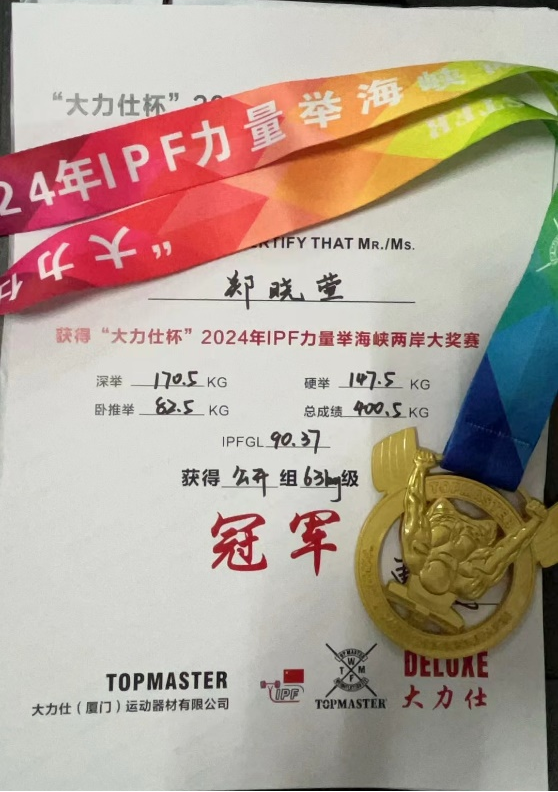 在随后的卧推和硬拉项目中,郑晓萱分别以82.5Kg和147.5Kg的成绩,将自己的总成绩锁定在400.5Kg,荣获63Kg女子公开组冠军。值得一提的是,硬拉作为她的弱项,在比赛的高压环境下,她依然稳住了心态,成功提升了个人最好成绩。