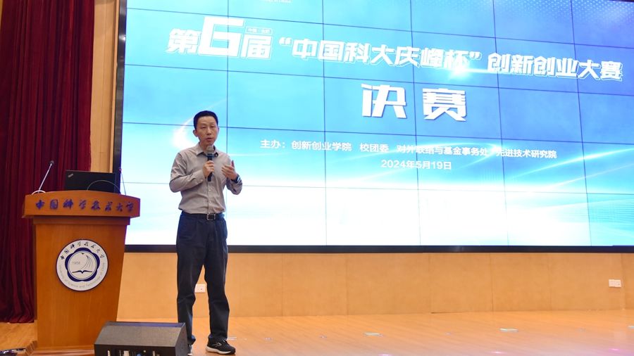 徐景明代表大赛专家评委致辞。他首先祝贺各项目团队经过层层选拔、脱颖而出,登上决赛舞台。他勉励科大学子努力学习、发扬企业家精神,把握时代脉搏,做与时代同频共振的科技创新人才,学校双创导师、专家们将共同为同学们的创意落地保驾护航。