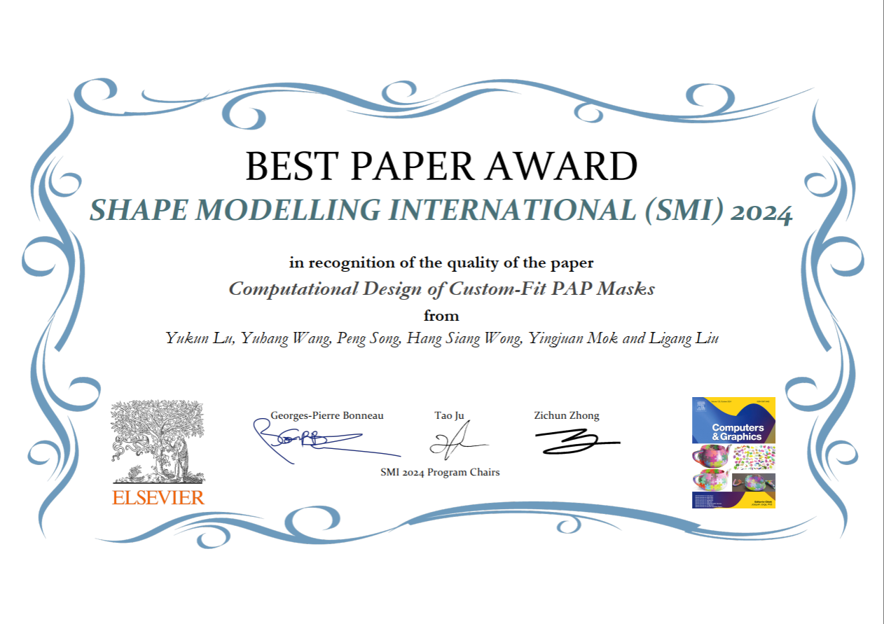 2024年7月,在美国底特律举行的国际会议 Shape Modeling International (SMI 2024) 上,中国科学技术大学数学科学学院的博士生卢俞锟同学的研究论文《Computational design of custom-fit PAP masks》荣获大会的Best Paper Award (最佳论文奖)。SMI会议是三维数字建模领域的国际旗舰会议,从1997年以来已召开20余届。每次会议上只评选一篇最佳论文奖。