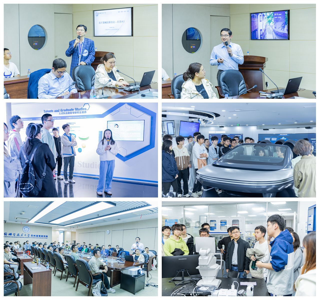 在苏州高等研究院,该院党政办公室主任钟逸向同学们介绍了苏州的自然人文风光和苏州高研院的建设发展历程,徐晓嵘教授介绍了iMED中心在生命医疗仪器与医疗器械方向的前沿进展。在工作人员的带领下,同学们先后参观了智能医疗器械研究中心和医学影像智能与机器人研究中心,了解关于生物先进制造、穿戴设备、血管工程和微纳制造等前沿领域的研究工作,对当前生命医疗科学前沿进展和未来发展方向加深了理解。