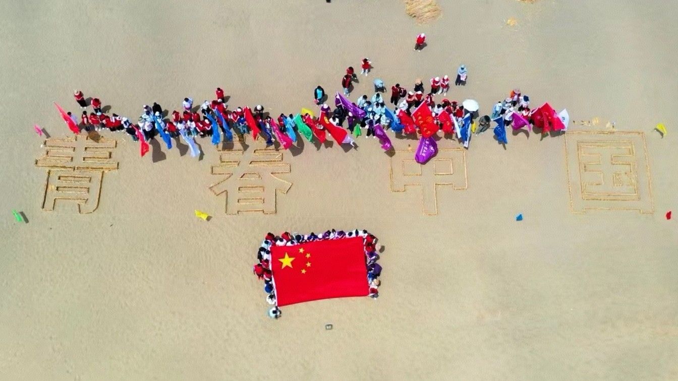 在和田县防沙治沙站,我校师生与四地青年共同投身生态实践。他们在技术人员的指导下,学习红柳、胡杨等耐旱植物的固沙原理,亲手栽种油莎豆,并以草方格拼接成“青春中国”巨型标识。
