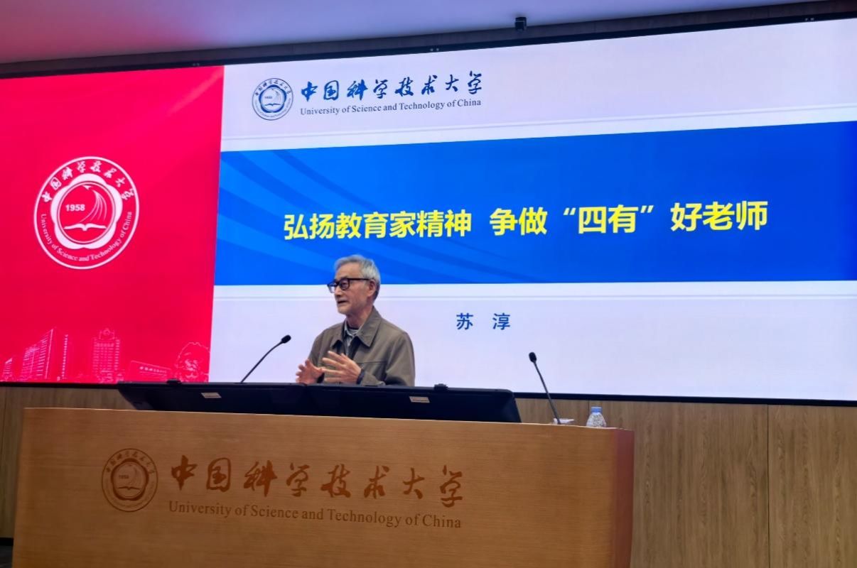 苏淳先生以《弘扬教育家精神,争做“四有”好老师》为题作报告,首先用一道概率题的人工智能解答为切入点启示大家教学重在思维培养,强调教师在教书育人过程中不可替代的作用。他指出,教育是帮助学生在掌握知识的过程中形成不断积累和反复思考的学习习惯。苏淳先生分享了在中国科大读研究生的经历。他表示,科大浓厚的学习氛围令他受益匪浅,他感恩于科大的人才培养和教育模式对自身产生的积极而又深远的影响。在科大任教40余年,苏淳先生传承了老一辈科学家和教育家的优良传统。对于指导研究生,他谈了三点感悟:一是要认真读书,读增长本领的书,不仅要读深读透,还要把书读活、长在心里;二是做研究离不开全面深入的调研,既要详细查阅资料,更要厘清问题的来龙去脉及发展趋势;三是要注重团队讨论,思想的火花往往是在相互、反复、深入的讨论中碰撞而成的。苏淳先生的报告赢得在场师生的阵阵热烈掌声。