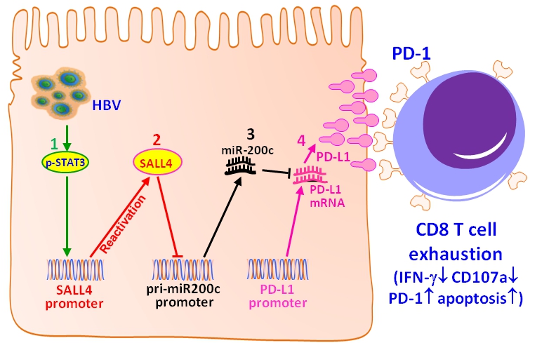 图. HBV感染通过HBV-pSTAT3-SALL4-miR-200c-PD-L1诱导T细胞耗竭