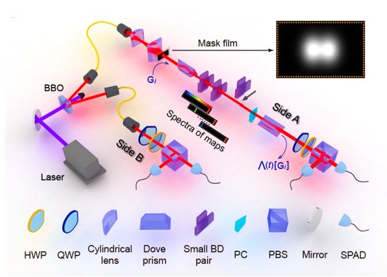 然而实验探测动力学演化的特征谱并非易事,因为这一理论是建立在几个算子之上的,而算子是无法在实验中制备的。为此,李传锋研究组提出用两个量子态单独演化的结果来实现所需的算子,并证明对于任意维度的演化过程,总可以找到两个量子态来等效实现所需的算子。实验中,研究人员利用光子的偏振态作为量子系统,光子的空间模式作为量子系统的环境,通过一系列小型偏振分束器把量子系统与环境耦合起来,并模拟系统的演化过程。他们分别对所制备的初态进行演化,并对末态进行量子态层析,最后通过一系列线性运算得到演化的特征谱,并利用特征谱方法准确地探测不同环境中演化的完全非马尔可夫性。