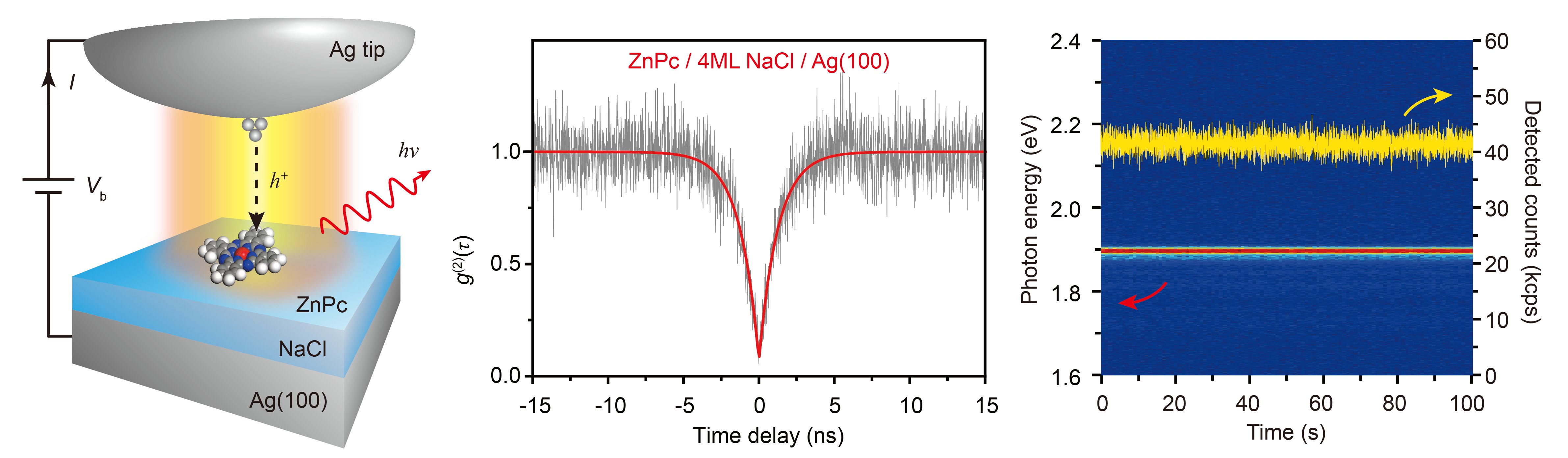 图注:左图为STM诱导单个分子电致发光的实验示意图;中间图为单分子发光的二阶相关函数测量结果,在时间延迟为0处的数值明显小于0.5,这表明发光具有显著的光子反聚束特征,展示了电泵单分子发光的单光子发射特性;右图为电泵单分子发光的强度和光谱的稳定性测量结果。