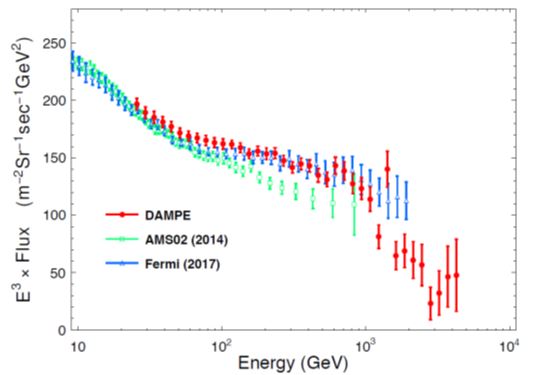 “悟空”卫星工作530天得到的高精度宇宙射线电子能谱(红色数据点),以及和美国费米卫星测量结果(蓝点)、丁肇中院士领导的阿尔法磁谱仪的测量结果(绿点)的比较