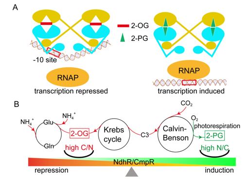 他们利用X-射线晶体学手段解析了蓝藻碳代谢全局性转录抑制子NdhR的三维结构,这是目前解析的第一个LysR家族转录抑制子全长蛋白的结构。通过大量的生化筛选,发现2-OG和2-PG分别是NdhR的协同抑制子和诱导子。结合结构生物学、生物化学和微生物遗传学实验,发现蓝藻中氮浓度偏低时,2-OG浓度升高,NdhR与2-OG结合后与DNA启动子区域的亲和力增强,从而抑制碳转运相关基因的转录,以维持蓝藻内的碳氮平衡。当蓝藻内碳浓度偏低时,2-PG浓度升高,NdhR结合2-PG后构象发生变化,从启动子区域释放下来,其抑制子活性被解除,碳转运相关基因大量表达,进而实现碳氮平衡。