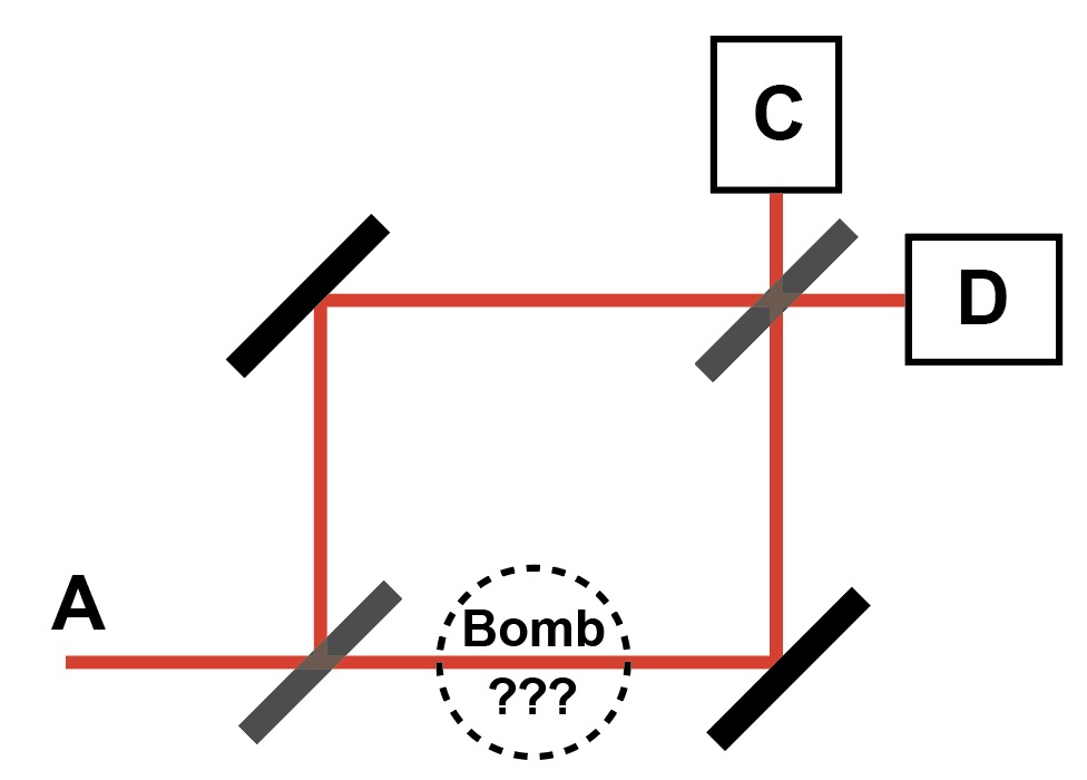 反事实直接量子通信,本质上是光的“波粒二象性”的集中体现。该方案最初的灵感来自于1993年提出的“炸弹测试模型”。如图1所示,在干涉仪的下臂中可能放有一个非常敏感的炸弹,即使只有一个光子遇到它,也会被其吸收并引发爆炸。为了探测炸弹是否存在,可以从A端向干涉仪中发射一个光子。如果炸弹不存在,由于干涉,光子将一定从端口C离开;如果炸弹存在,则光子要么通过下臂被炸弹吸收,要么通过上臂,并以相同的概率从端口C或D离开。因此综合来看,如果最终在端口D探测到一个光子,那么炸弹一定存在于干涉仪中。值得注意的是,这里我们只发射了一个光子,如果这个光子在端口D被探测到,那么它一定没有通过干涉仪的下臂,然而我们却得到了炸弹存在的信息。这在后来被称为“无相互作用测量(interaction-free measurement)”。在此基础上,再利用量子芝诺效应(quantum Zeno effect),可以大大提升上述无相互作用测量的成功率。