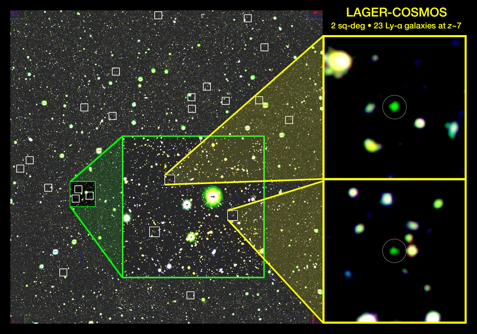 图:观测获得的23个宇宙早期z~7.0星系的分布(白色方框)及其中两个最亮源的放大图。