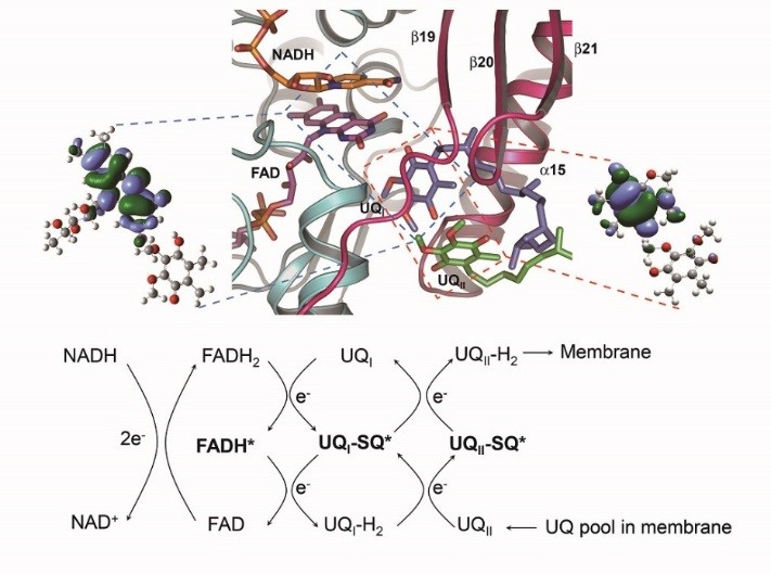 线粒体被认为是细胞中的动力工厂,线粒体内膜上的呼吸链(又称电子传递链)将细胞代谢途径中产生的电子从NADH或FADH2向氧分子(0 2)传递,最终生成ATP,负责为生物体提供能量。酵母Ndi1蛋白是呼吸链中发挥重要作用的一类NADH氧化还原酶,能够以FAD为辅基催化电子从NADH传递给泛醌(UQ)。前期清华大学杨茂君实验室和中国科大田长麟实验室通过合作研究,解析了Ndi1的高分辨率晶体结构及Ndi1与NADH、UQ以及NADH-UQ三种底物复合物的晶体结构,并应用电子自旋共振(Electron Spin Resonance, ESR)方法揭示Ndi1中同时存在两个泛醌(UQ1,UQ11结合位点(Nature 2012, 491 (7424), 478-82)。经典线粒体复合物借助一系列铁硫簇(Fe-S cluster)间的反铁磁相互作用(antiferromagnetism, AFM)介导的“量子隧穿”效应完成电子传递,但Ndi1蛋白中并不含有铁硫簇,其电子传递机制研究具有特殊意义。