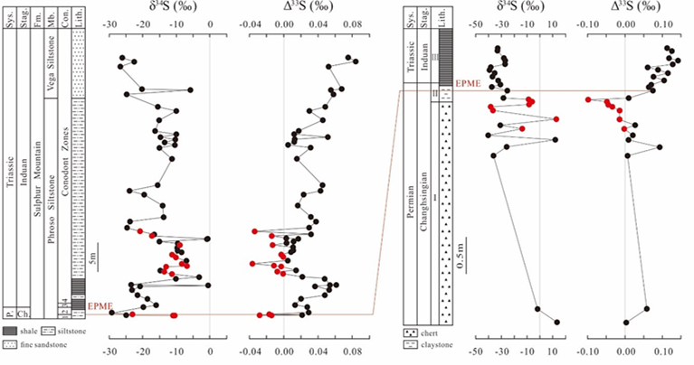 沈延安教授课题组对位于泛古洋东部的Opal Creek剖面 (现位于加拿大西部) 和西部的Gujo-Hachiman剖面 (现位于日本)进行了高精度的多硫同位素研究,发现二叠纪末期生命灭绝之前、生命灭绝期间以及生命灭绝之后都记录了异常的硫同位素组成(见下图)。因此,研究者提出硫化海水的间歇性上涌是造成大规模生命灭绝和随后生命迟缓复苏的主导因素。这一研究成果表明,古海洋环境的剧烈变化对早期生命演化具有重要影响。该成果能够对研究现代人类活动与全球气候环境变化的相互作用提供重要启示。