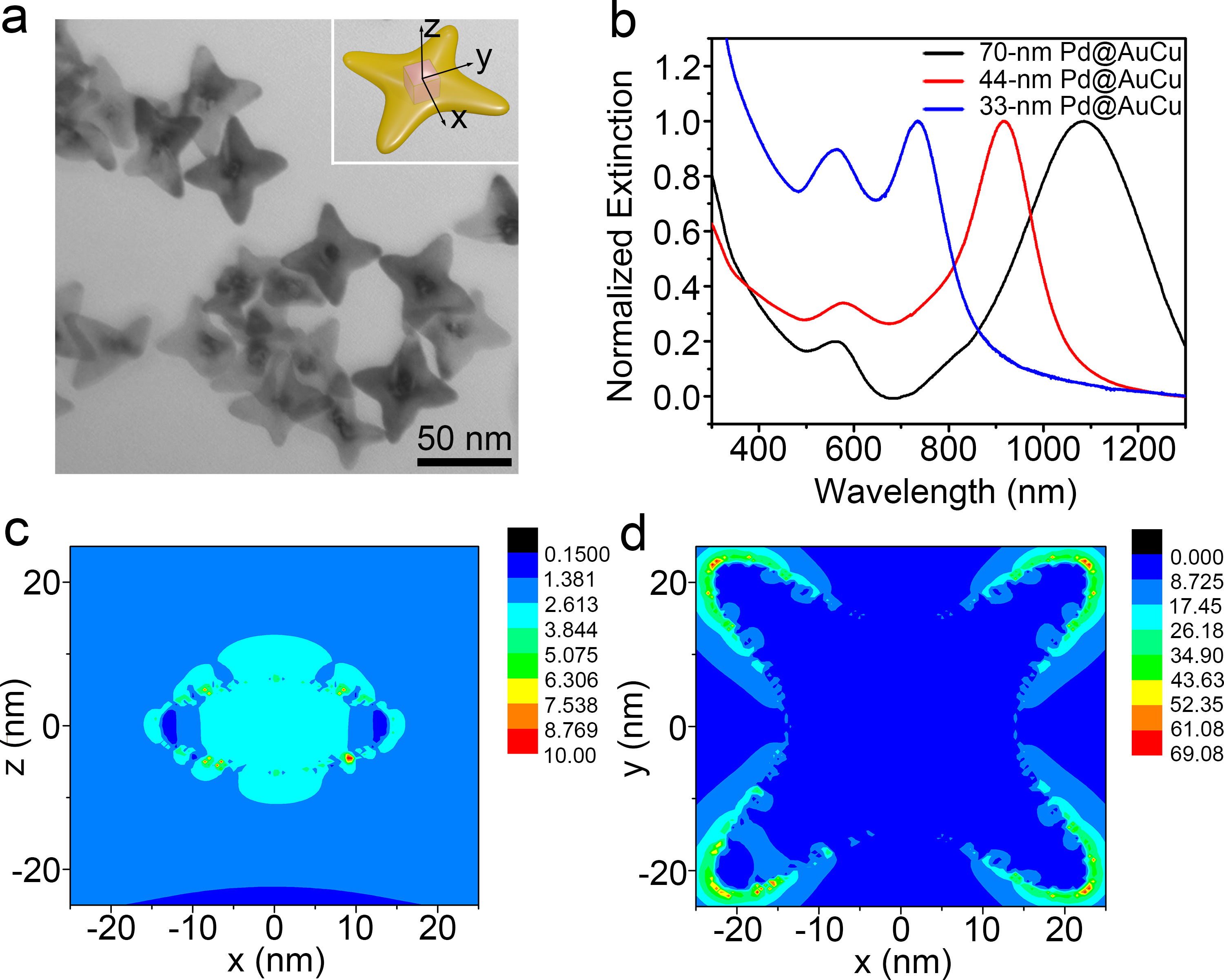 近日,中国科学技术大学合肥微尺度物质科学国家实验室和化学与材料科学学院曾杰教授课题组在低对称性金属纳米晶的局域表面等离激元调控研究上取得重要进展。研究人员基于晶体生长的动力学调控和不同金属间的晶格失配成功构筑具有低对称性的Pd@AuCu核-壳平面四角叉结构,并实现对其局域表面等离激元面内偶极振动模的位置从可见光区到近红外区的范围内的精确调控。由于存在丰富的局域场“热点”,该纳米晶还具有优越的表面增强拉曼散射性能。该成果以“Integration of Kinetic Control and Lattice Mismatch to Synthesize Pd@AuCu Core-Shell Planar Tetrapods with Size-Dependent Optical Properties”为题发表在5月11日的《纳米快报》上[Nano Letters, 2016, 16, 3036-3041]。论文共同第一作者为硕士生孟敏和硕士生方智成。