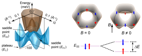 具有蜂巢状六方晶格的二维材料,在动量空间中其导带和价带边附近的能带通常存在简并的极值,即能谷态(valleys)。Bi(111)表面结构是类蜂巢状六方晶格,因而其表面电子态具有涡旋状自旋态的多能谷的能带结构。该研究团队利用低温(4.2 K)强磁场(11 T)扫描隧道显微镜(STM),获得不同磁场下Bi(111)超薄薄膜表面的朗道量子化微分电导谱,并利用类比于传统磁振荡实验的分析方法,精确地测量了量子化朗道能级,辨析出源于表面电子型和空穴型能谷电子态。同时,还观察到对应于能带结构中一组具有很大g因子(~33)的范霍夫奇点表面态由于在强磁场中出现分裂,从而可以获得自旋极化的能谷电子态。该工作表明, Bi(111)超薄膜的这些性质使其有可能应用于构造自旋和能谷电子学器件。