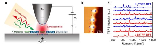 图注:a. TERS的原理示意图。b. 交替吸附在Ag台阶上并处于范德华接触距离(约0.3 nm)的两种不同卟啉分子的STM图像。c. 在b图中相应分子中心位置采集的TERS光谱以及理论模拟光谱。