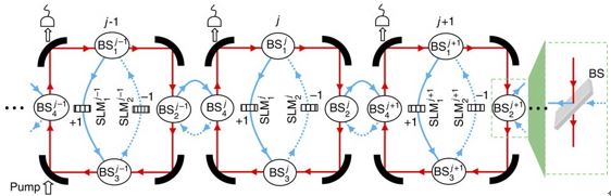 周正威等人从理论上构建了一个新型的量子模拟研究平台,可以仿真格点上的玻色子系统在各种人工规范场下的物理。其基本思想是设计一个能够容纳非常多模式且每个模式能量相同的简并光腔。在这里,这些简并模式是光学Laguerre-Gaussian模式中的轨道角动量自由度。通过诱导不同模式之间的隧穿,原则上,在一个简并光腔系统中可以模拟一维耦合的谐振子链。通过级联若干个简并光腔,则可以模拟二维格点上的玻色子系统。在这项研究中,他们设计了如何在级联简并腔系统中模拟人工的阿贝尔、非阿贝尔规范场,以及如何探测能带中Bloch波的性质,进而探测能带陈数、边缘模等拓扑不变量;如何模拟拓扑量子相变。