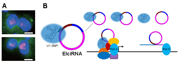 A,外显子-内含子环形RNA(图中红色)定位于细胞核内(图中蓝色);B,外显子-内含子环形RNA (EIciRNA)和RNA聚合酶II (Pol II)相互作用调控基因转录的分子机理示意图。