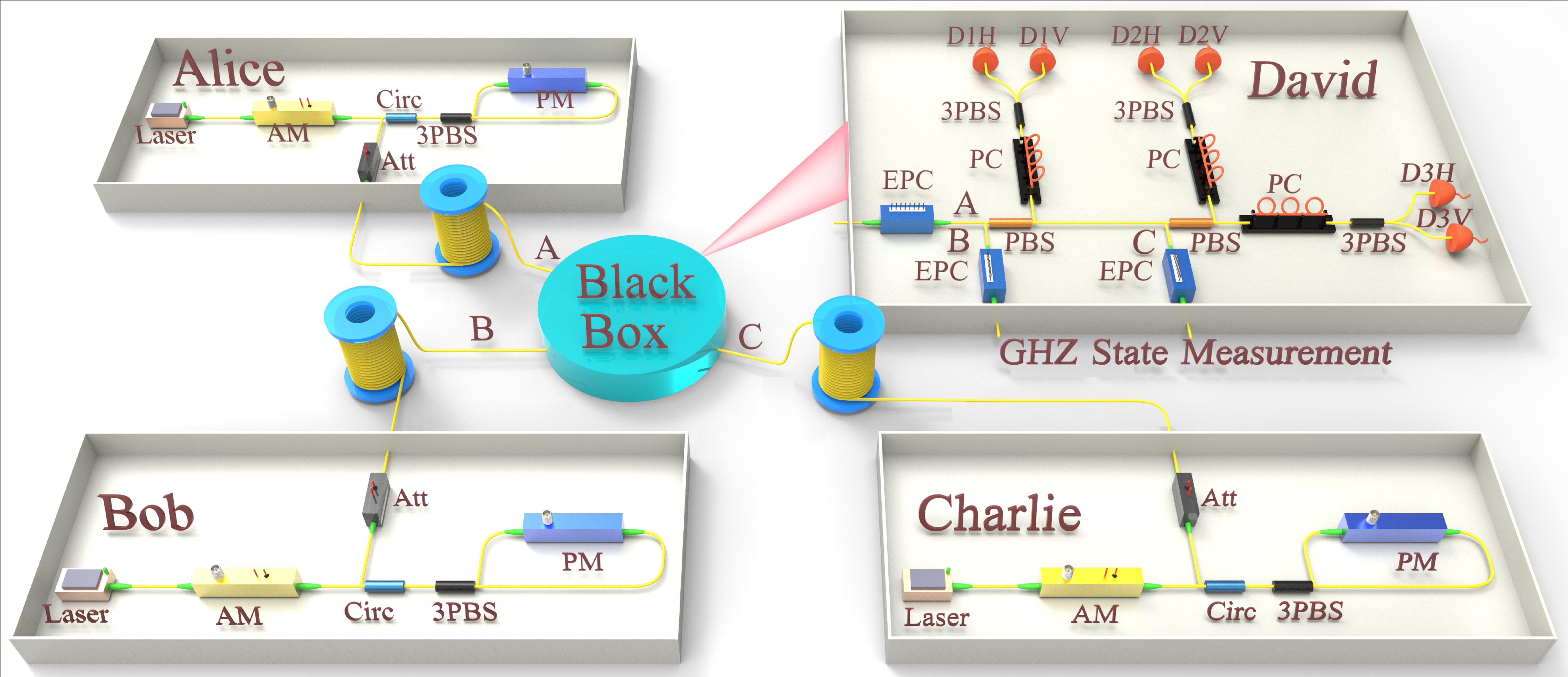 富尧、尹华磊等人提出了在三个合法用户(Alice,Bob和Charlie)间共享后选择多光子纠缠态的实用化方案,其中后选择测量仪器可以看作被包括窃听者在内的任何人操控的黑盒子。结合诱骗态理论,该方案可以利用传统激光源实现多用户间的远距离多光子纠缠分发,并由此实现多方量子通信。该方案可以抵御所有的探测器攻击和光源的光子数分离攻击,同时,用纠缠纯化技术保证多方量子密钥的无条件安全。该研究结果既不预先制备多光子纠缠态,也无需远距离分发高保真多光子纠缠态,大大提高了利用多光子纠缠态的多方量子通信实验的传输距离和成码率,使实际应用测量设备无关的多方量子通信成为可能。