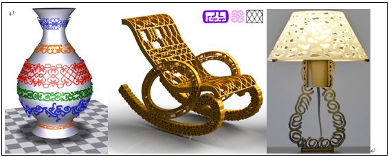 传统矢量合成技术将着眼点锁定在样本合成的老问题上,却忽略了重要的一个维度:“拓扑”,导致合成出的矢量图案总是容易破碎且带有单调重复。而本方法通过引入拓扑描述子,在“拓扑+样本”的扩展空间中计算最优解,松弛了由于仅考虑连续性和相似性导致的结构残缺趋势,并提供了大量拓扑可控的优秀合成结果。该方法还可生成无破损的三维矢量纹饰,它们可直接利用普通三维打印机制造成型,部分产品如下所示: