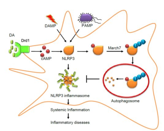炎症小体是一种由细胞浆内天然免疫识别受体参与组装的多蛋白复合物,能够介导 IL-1 等多种炎症介质的产生,对炎症反应的发生至关重要,并参与肿瘤、神经退行性疾病、代谢性疾病等多种人类炎症相关重大疾病的发生发展。由于炎症小体在炎症性疾病发生中的关键作用,其活化必然受到机体严格的调控,但是炎症小体活化的调控机制还很不清楚。该项工作中研究人员发现神经递质多巴胺可以很好的抑制巨噬细胞中NLRP3炎症小体的活化,从而抑制IL-1等炎症因子的分泌。进一步的研究发现多巴胺可以通过其受体DRD1诱导NLRP3的泛素化和降解。多巴胺诱导的NLRP3泛素化和降解依赖一种E3连接酶MARCH7。最后研究者还发现多巴胺可以通过对NLRP3炎症小体的抑制缓解神经炎症导致的多巴胺神经元损伤以及外周炎症导致的腹腔炎。该项工作不仅发现了一种NLRP3炎症小体的内源性调控机制,还为炎症性疾病的治疗提供了潜在的干预靶点。