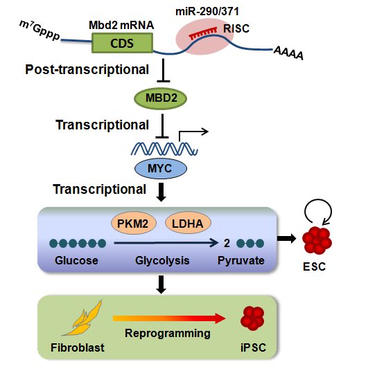近年来的研究发现,胚胎干细胞和诱导多能性干细胞的代谢方式也存在有氧糖酵解增强的现象,即类似于肿瘤细胞中的Warburg effect,但其背后的调控机制及其对干细胞多能性的影响并不清楚。为了探究这一科学问题,高平课题组和汪阳明课题组采用Dgcr8-/-干细胞体系研究miRNA对代谢的调控作用,发现将miRNA加工蛋白Dgcr8敲除后,干细胞中的葡萄糖摄取、乳酸产生等指标明显降低,说明细胞糖代谢水平受到明显削弱。将miR-290 簇miRNA回补后将逆转这一现象。机制研究发现miR-290簇通过靶向抑制DNA甲基结合蛋白Mbd2,从而解除Mbd2对癌基因Myc的抑制。活化的Myc作为转录因子促进糖代谢酶Pkm2和Ldha的表达,进而促进干细胞代谢水平和体细胞重编程。这一通路在人的细胞中也保守存在(人的细胞中同源是miR-371簇)。miR-290-Mbd2-Myc-Pkm2/Ldha这一调控通路的发现揭示了miRNA调控干细胞代谢和体细胞重编程的新机制。